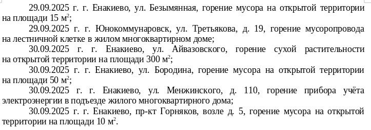 1 октября 2025 года на территории городского округа Енакиево завершилось действие особого противопожарного режима, действовавшего с 1 июня 2025 года. Во время действия особого противопожарного режима зафиксировано большое число возгораний, и, в основном, это возгорания мусора и сухой растительности. К сожалению, в большинстве случаев такие возгорания происходят по вине человека, а жаркая сухая погода создает благоприятные условия для быстрого распространения огня.