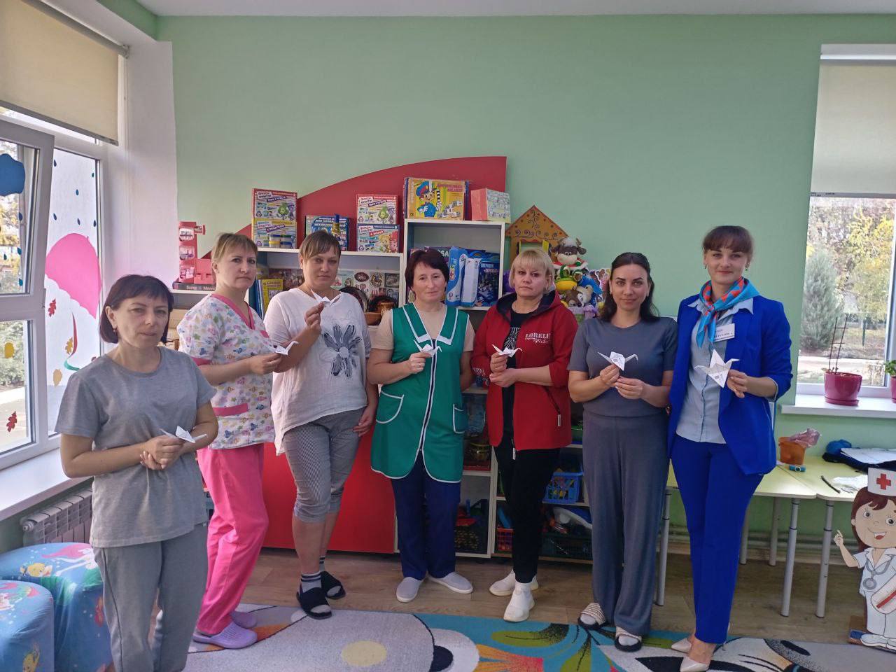 Для сотрудников учреждения был проведен мастер-класс по изготовлению бумажных белых журавликов, а с юными воспитанниками профконсультанты обсудили профессии настоящих мужчин, раскрасили раскраски с изображением профессий и примерили костюмы рабочих специальностей.