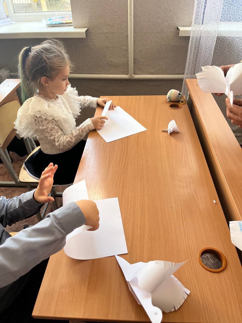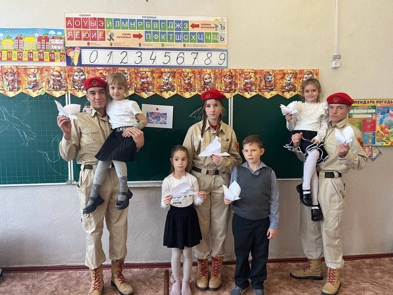 Юнармейцы отряда ВПК «Пламя» штаба местного отделения городского округа Харцызска СШ № 4, ученики из 9-А класса Воробьев Сергей, Уманец Алина и Матинян Михаил принимают участие в акции «Белые Журавли». Ребята провели мастер-класс для обучающихся начальной школы,по изготовлению журавлей в завершение Акции, раздали бумажных журавлей жителям города.
