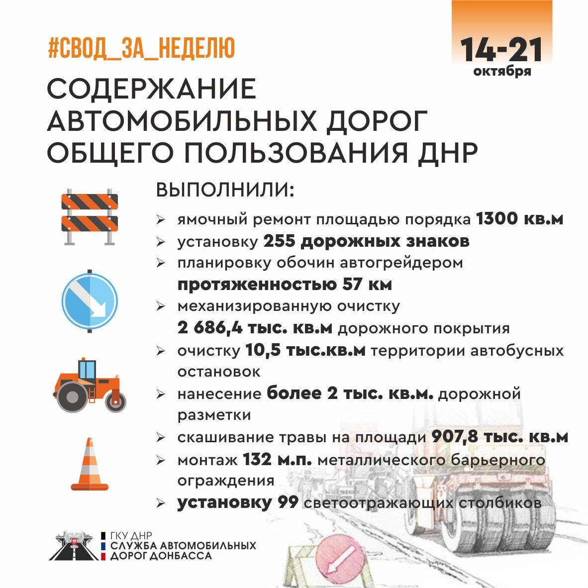 С 14 по 21 октября дорожники под контролем ГКУ ДНР "Служба автомобильных дорог Донбасса" в рамках содержания автомобильных дорог общего пользования выполнили: