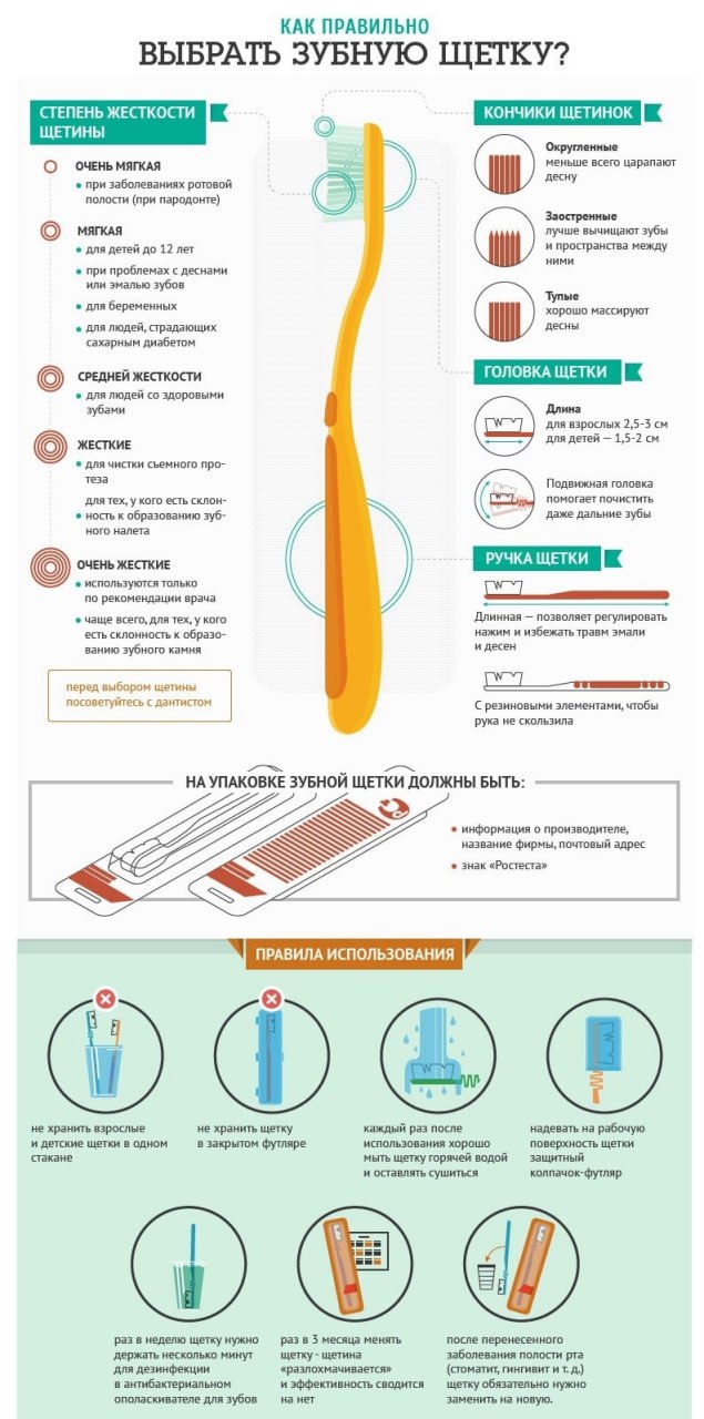 Начнём с выбора зубной щетки. Прежде всего обратите внимание на размеры головки щетки: маленькая головка лучше справляется с задачей, так как позволяет аккуратно очистить даже труднодоступные участки полости рта. Второе важное условие — материал щетины. Специалисты советуют приобретать щетки с искусственными щетинами, поскольку натуральные материалы могут способствовать размножению бактерий. Очень важны и форма щетины: округлые, слегка закругленные щетинки наносят наименьший ущерб эмали и деснам, предотвращая травмы слизистой оболочки.