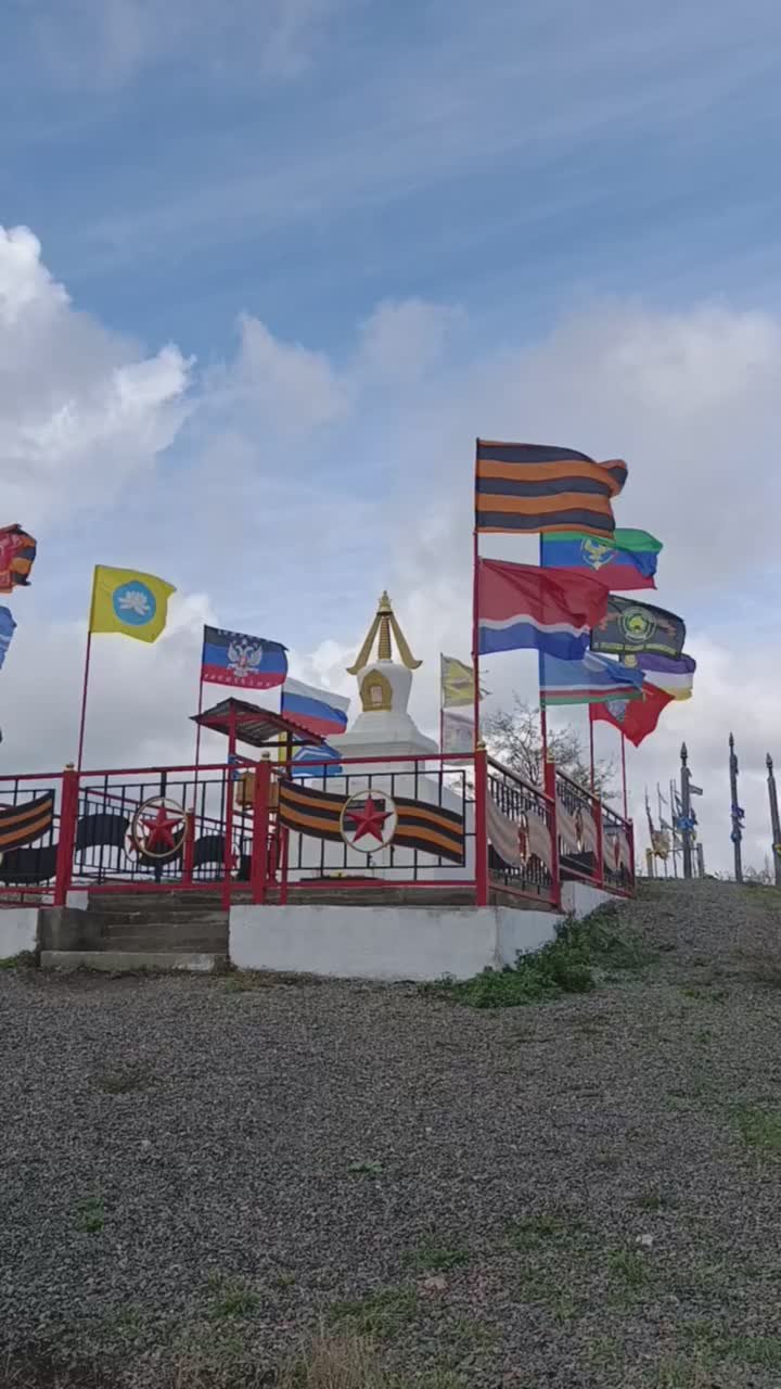 Над памятником подняли флаги России, ДНР, Бурятии, Знамя Победы и буддийский флаг Хии Морин (Конь Ветра), дарующий защиту и приносящий удачу.