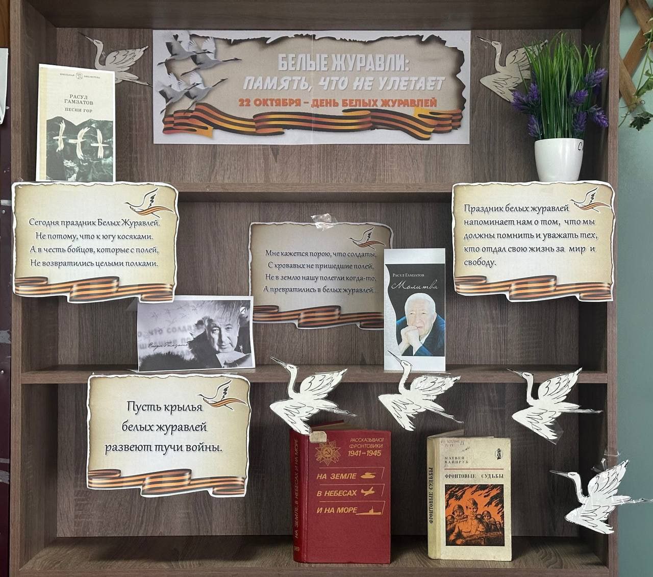 В Хомутовской сельской библиотеке открылась выставка-память «Белые журавли: память, что не улетает». Здесь представлены книги и иллюстрации о погибших на войнах.
