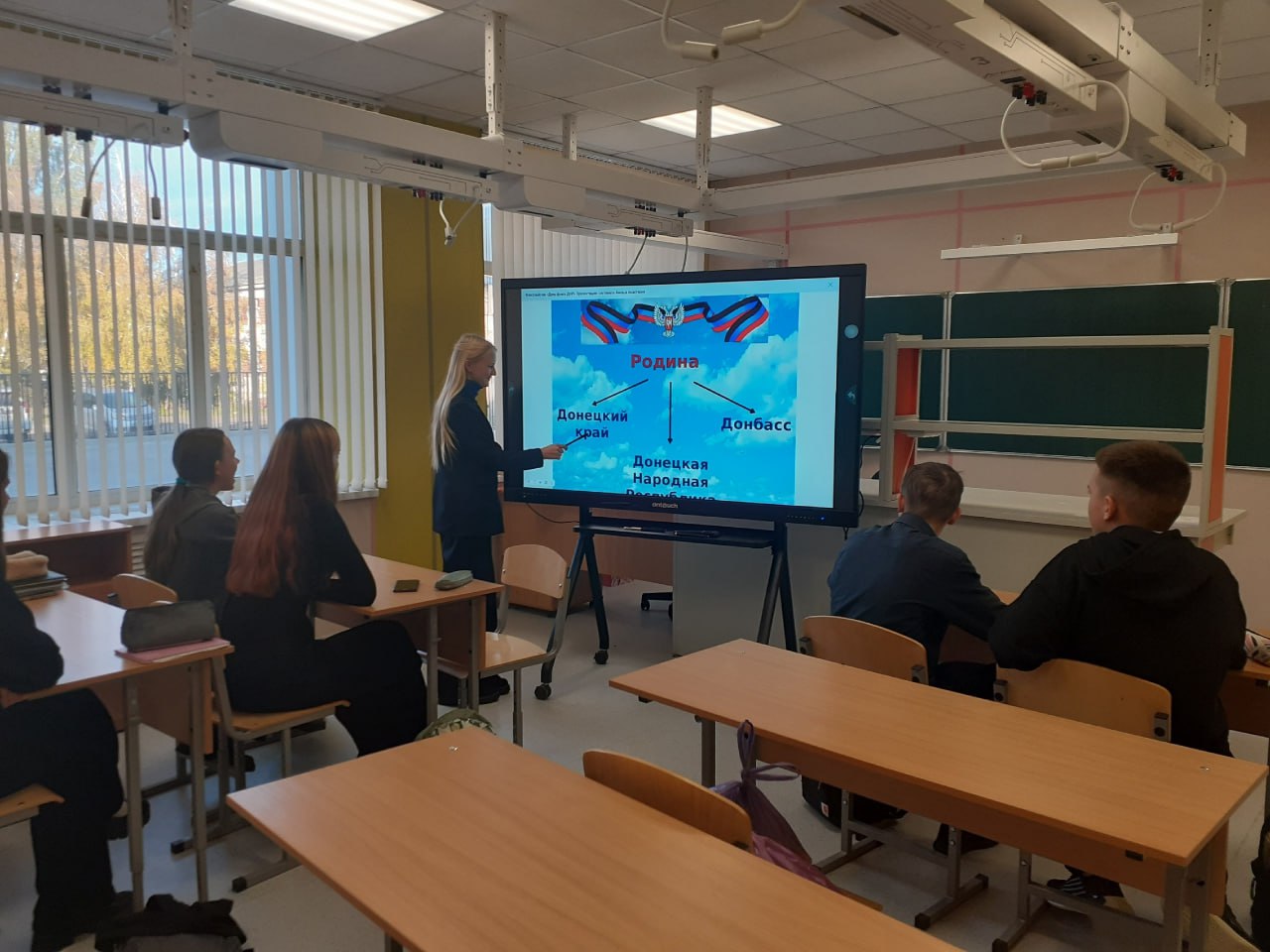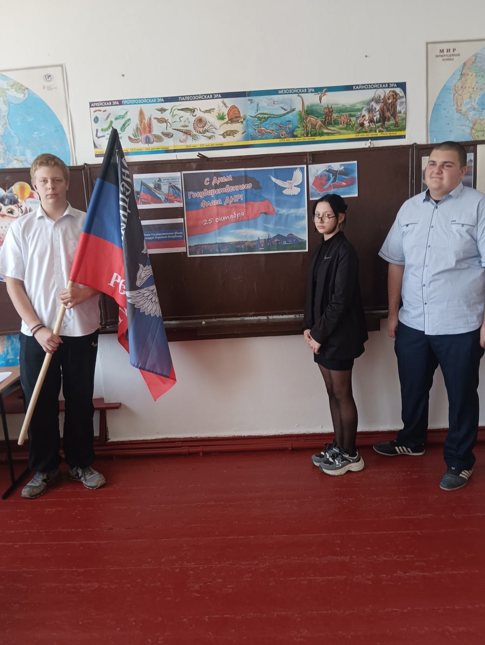 Ученики участвовали в викторинах, складывали пословицы о Родине, выполняли интеллектуальную эстафету «Флаг моей Родины». Они вспомнили этапы становления государства и обсудили значение цветов флага. Эти занятия вызвали у школьников чувство гордости и сопричастности к истории ДНР. Развевающийся флаг олицетворяет единство, движение и жизнь.