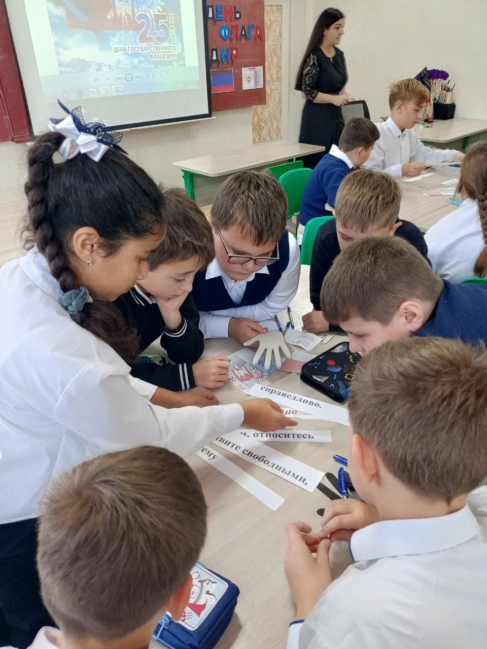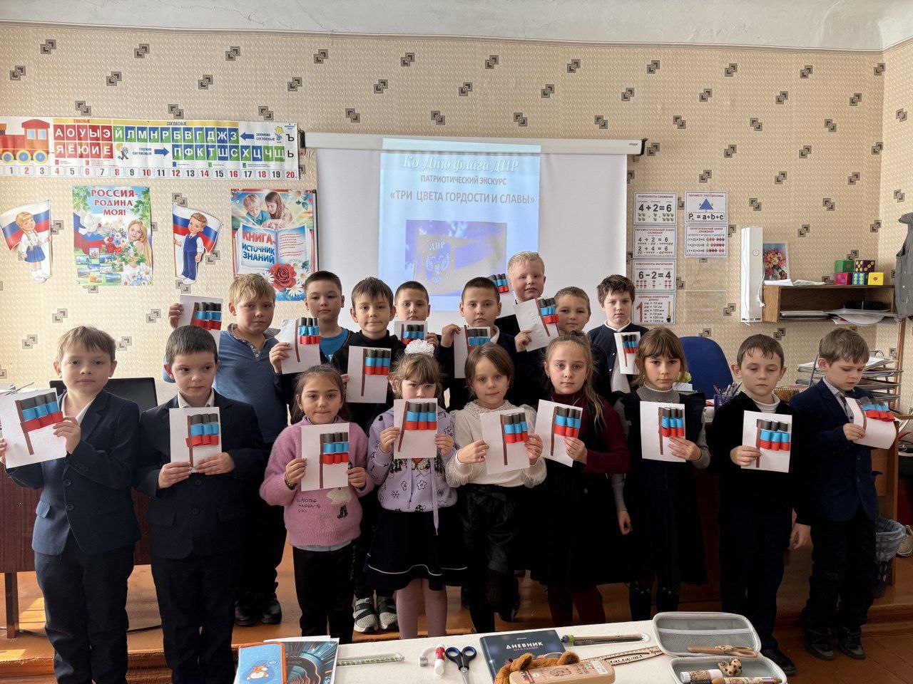 В классах проходили беседы и классные часы, где учителя рассказывали ученикам о том, какую роль играет флаг в жизни государства и каждого гражданина. Обсуждалась история его создания, символика цветов и значение флага как объединяющего начала для народа. Ребята с интересом слушали, задавали вопросы и делились своими мыслями о том, что для них значит флаг Донецкой Народной Республики.