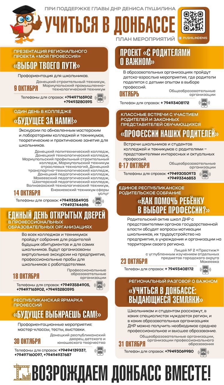 В рамках акции, инициированной Главой ДНР Денисом Пушилиным, уже прошло около 2,7 тысяч тематических мероприятий - мастер-классы, профориентационные тесты, лекции, встречи с работодателями на предприятиях, классные часы, дни открытых дверей и многое другое. Также было проведено Республиканское родительское собрание, где обсудили, как помочь ребенку с выбором профессии.
