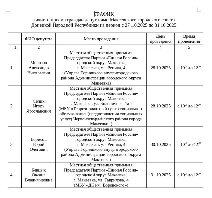 Уважаемые жители города!. Предоставляем вам график личного приёма граждан депутатами Макеевского городского совета Донецкой Народной Республики на период с 27.10.2025 по 31.10.2025