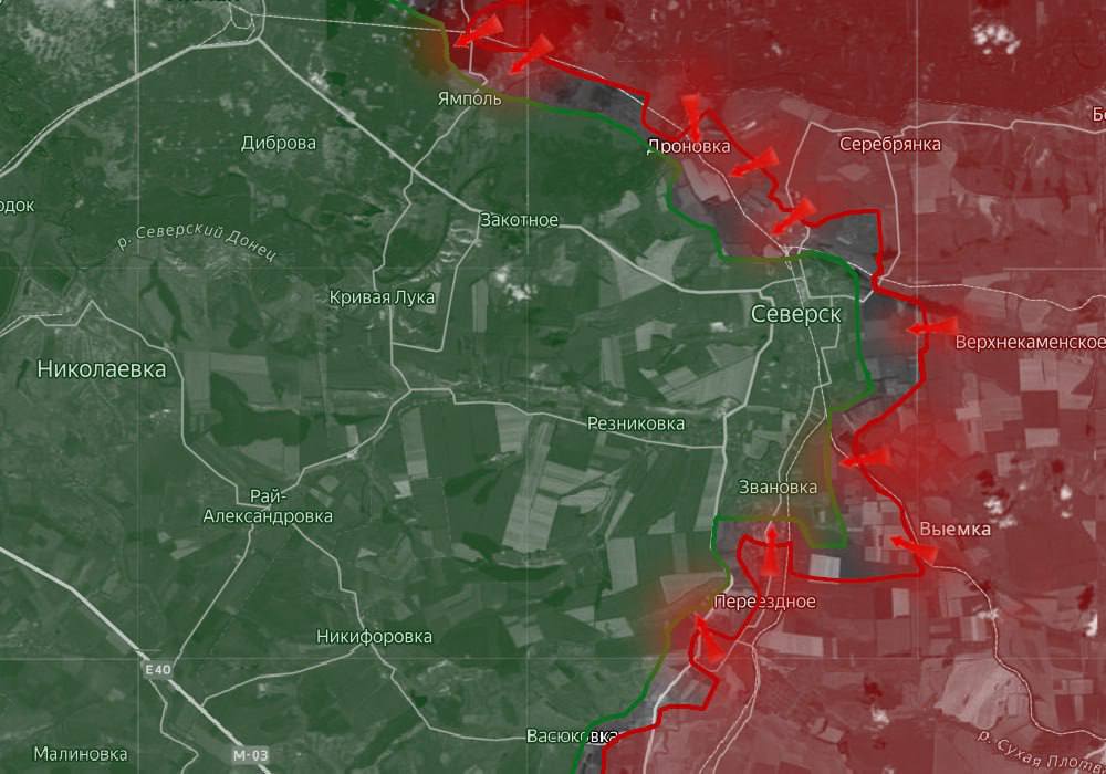 «На Северском направлении российские войска пытаются взять в «клещи» Северск с севера и юга, закрепившись на опорных пунктах в двух-трех километрах от города.