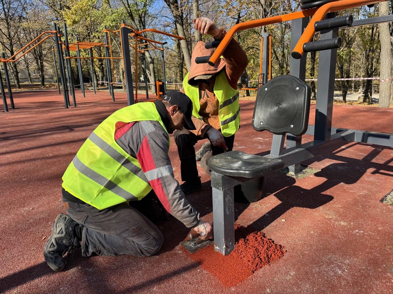 Строители уже смонтировали в парке современные площадки с уличными тренажерами, а также оборудовали специальную зону для выгула собак.
