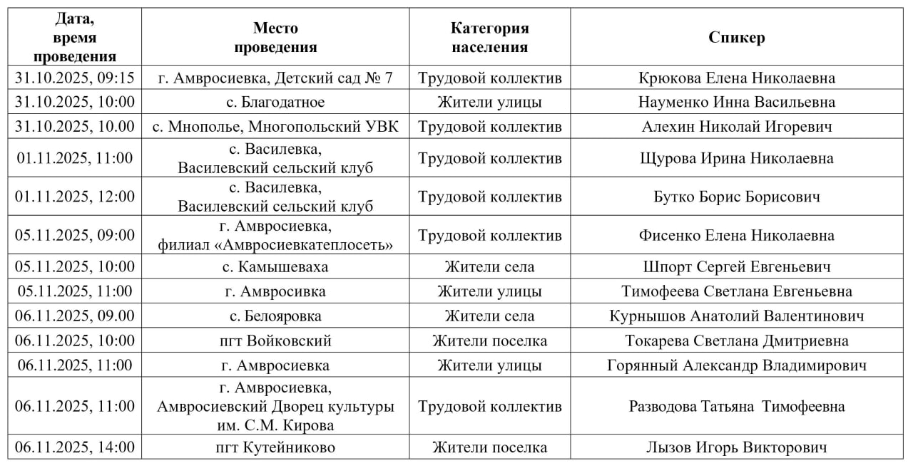 График проведения встреч с населением на подведомственных территориях руководящим составом администрации Амвросиевского муниципального округа, начальниками территориальных отделов администрации округа с 31 октября по 6 ноября.