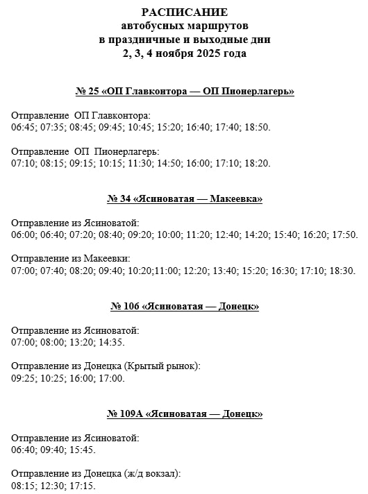 Администрация Ясиноватского муниципального округа сообщает, что 2,3,4 ноября 2025 года муниципальный маршрут № 25 «ОП Главконтора – ОП Пионерлагерь», межмуниципальные маршруты № 34 «г.Ясиноватая (ж/д вокзал) – г. Макеевка (АС)», № 106 «г.Ясиноватая (ж/д вокзал) – г.Донецк (Крытый рынок)», № 109А «г.Ясиноватая (ж/д вокзал) – г. Донецк (ж/д вокзал)» будут осуществлять движение по графику праздничного и выходного дня.