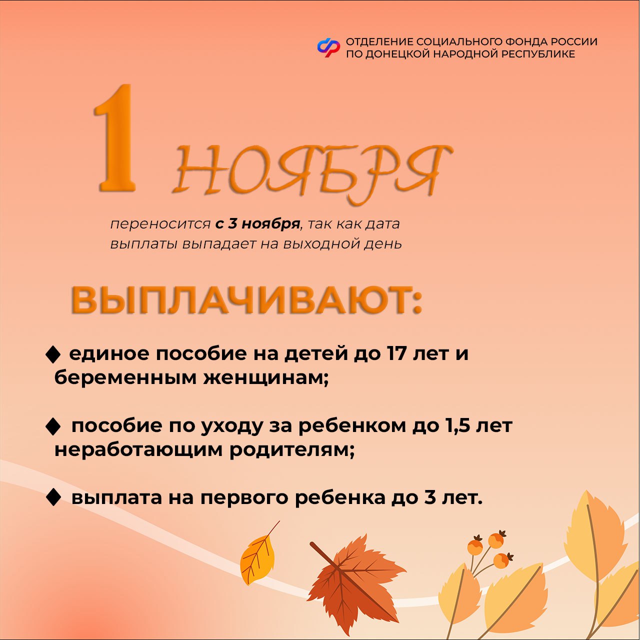 1 ноября через банки поступят пособия, которые по обычному графику выплачиваются 3-го числа. Это связано с трехдневными выходными и праздничными днями в начале месяца. Речь идет о: