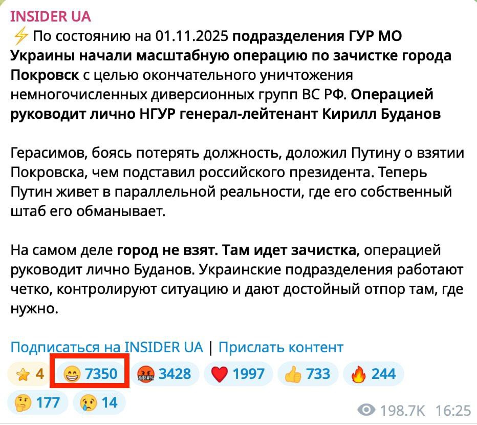 К слову, о взятии Покровска не сообщил пока ни один канал или СМИ. Все остальное классика — придумать "инсайд" и в нем же победить. Скучно...