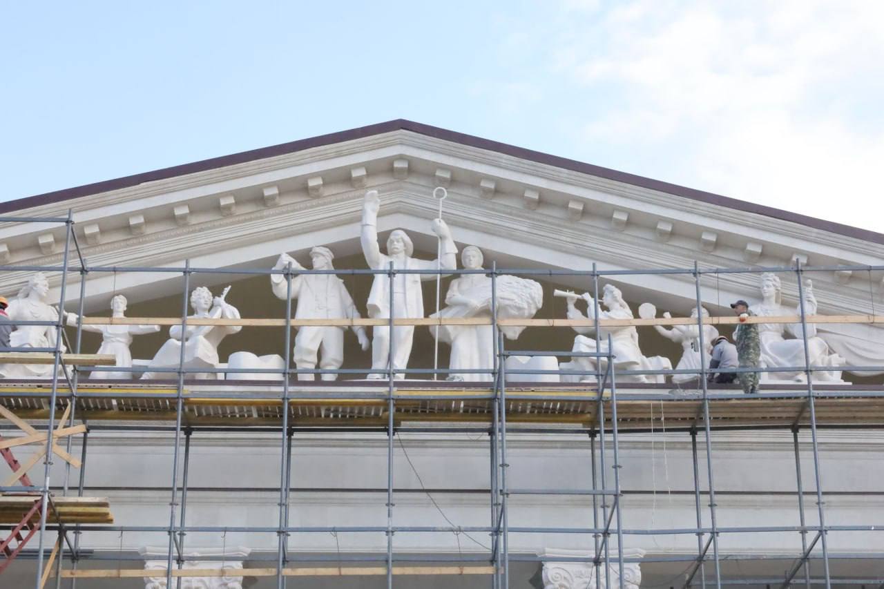 На фронтоне театра уже установлены девять скульптурных фигур. Параллельно с этим идет благоустройство прилегающей территории, продолжаются ремонтные работы и монтаж сложнейших театральных конструкций, включая поворотный круг сцены.