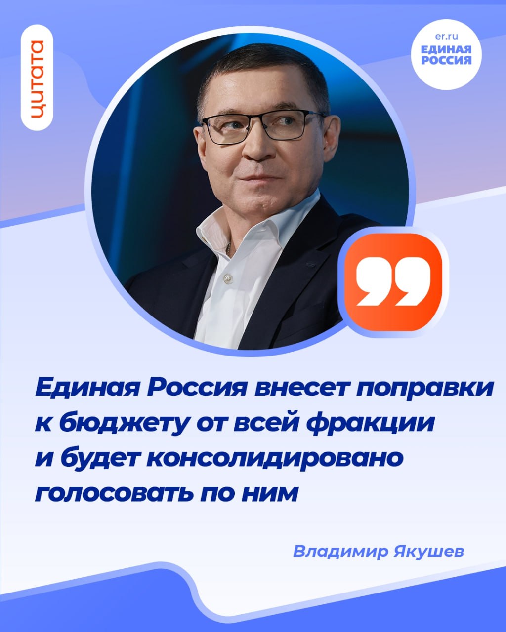 «Партия работала над документом вместе с Правительством, он в целом обеспечивает финансирование основных направлений народной программы.Тем не менее, Единая Россия внесёт ко второму чтению бюджета поправки, которые обеспечат дополнительные средства по ряду социально-значимых направлений.