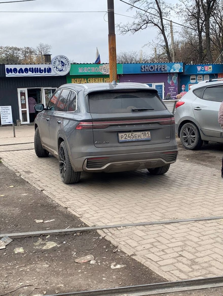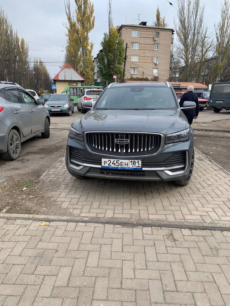 Geely Monjaro на луганских номерах без особого стеснения припарковался на тротуаре возле рынка «Объединённый» на Пролетарке.