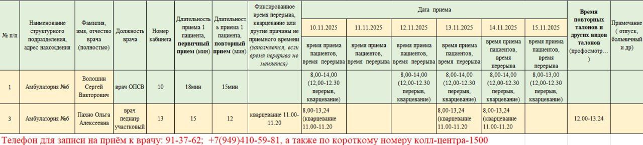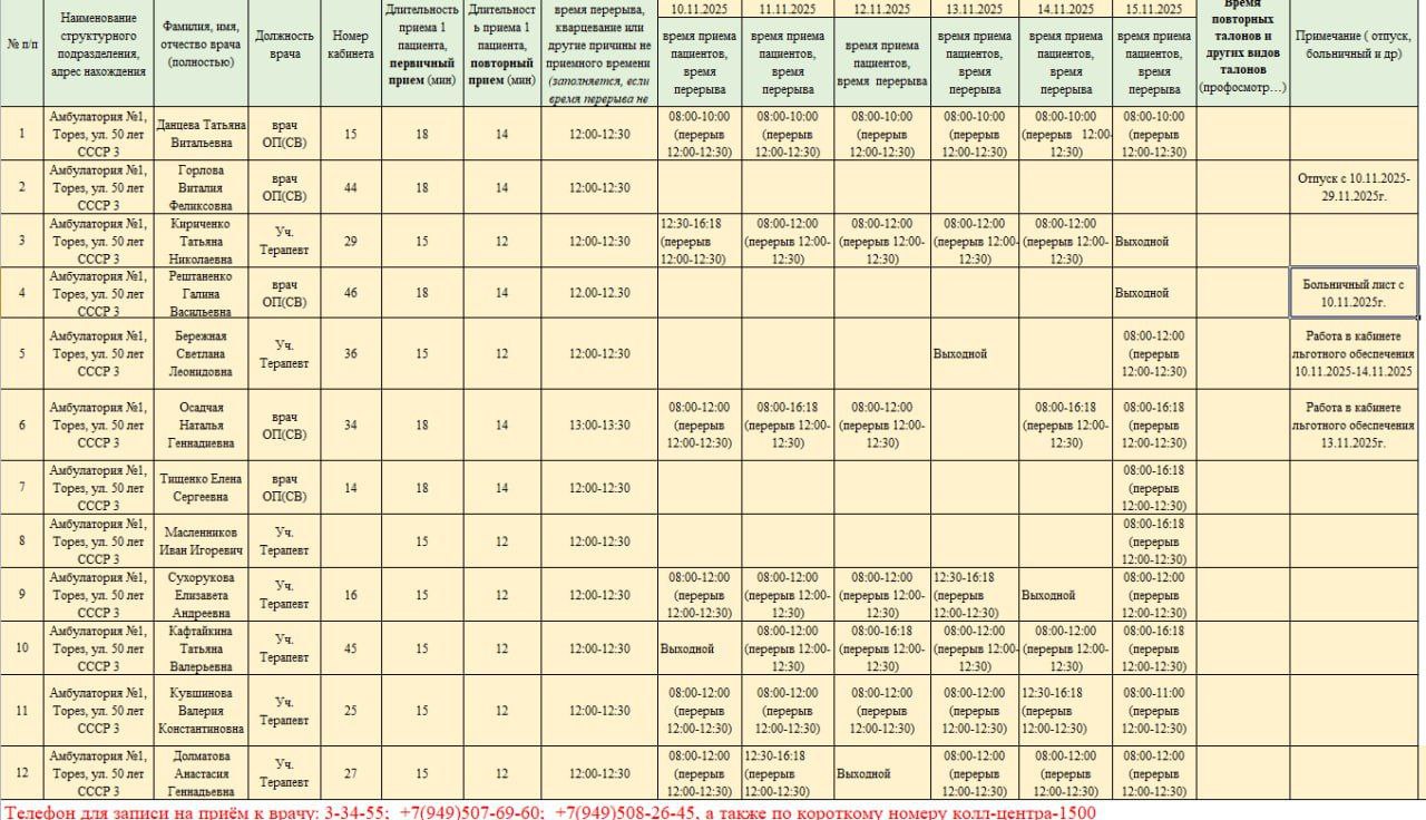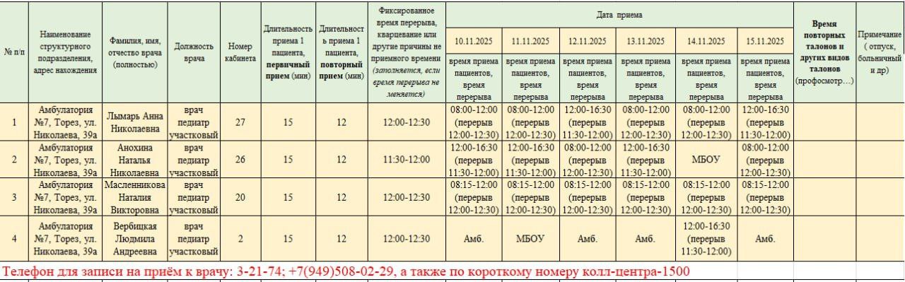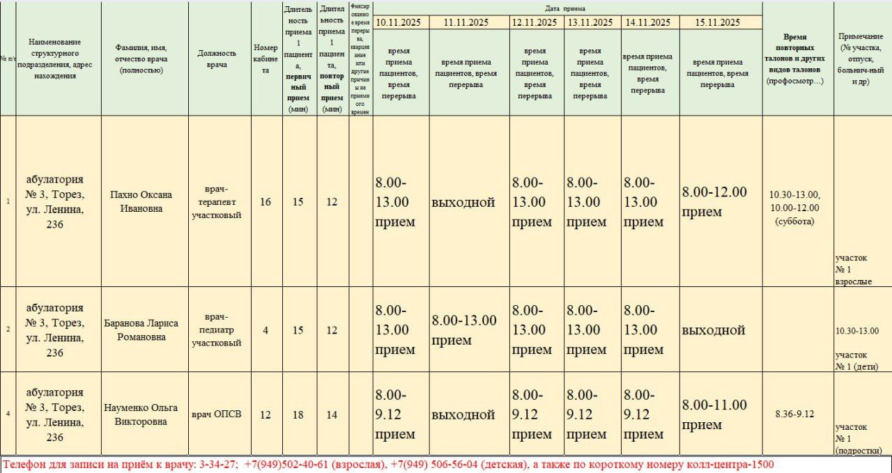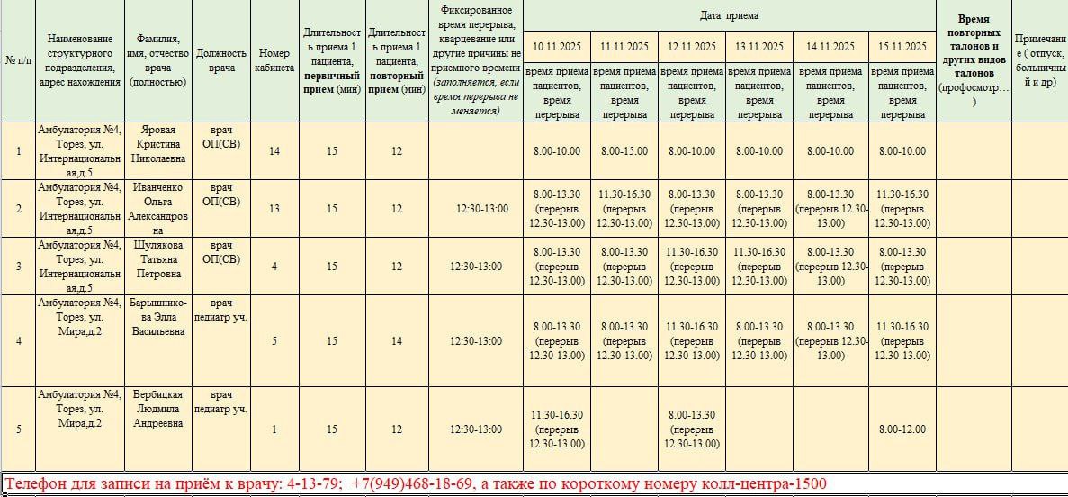 График приёма пациентов врачами амбулаторий ГБУ ДНР "ЦПМСП г. ТОРЕЗА" с 10.11.2025-08.15.2025г