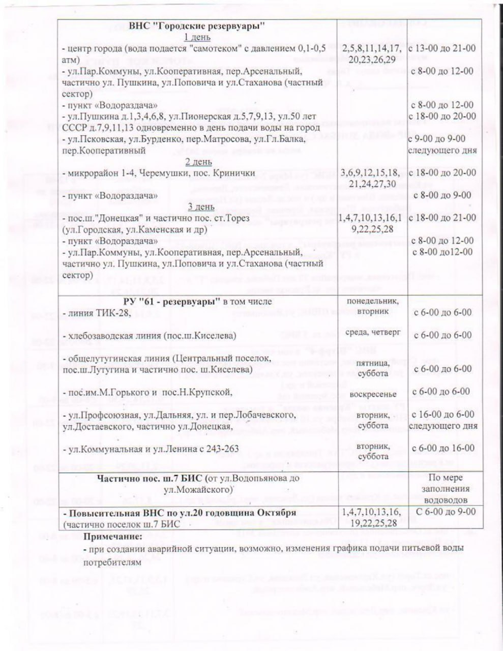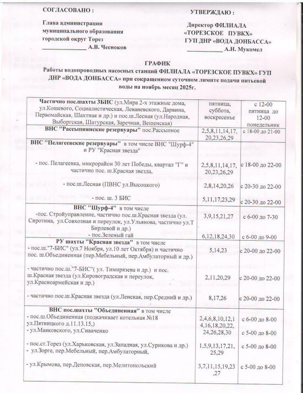 ГРАФИК работы водопроводных насосных станций ФИЛИАЛА «ТОРЕЗСКОЕ ПУBKX» ГУП ДНР «ВОДА ДОНБАССА» при сокращенном суточном лимите подачи питьевой воды на ноябрь 2025 года.