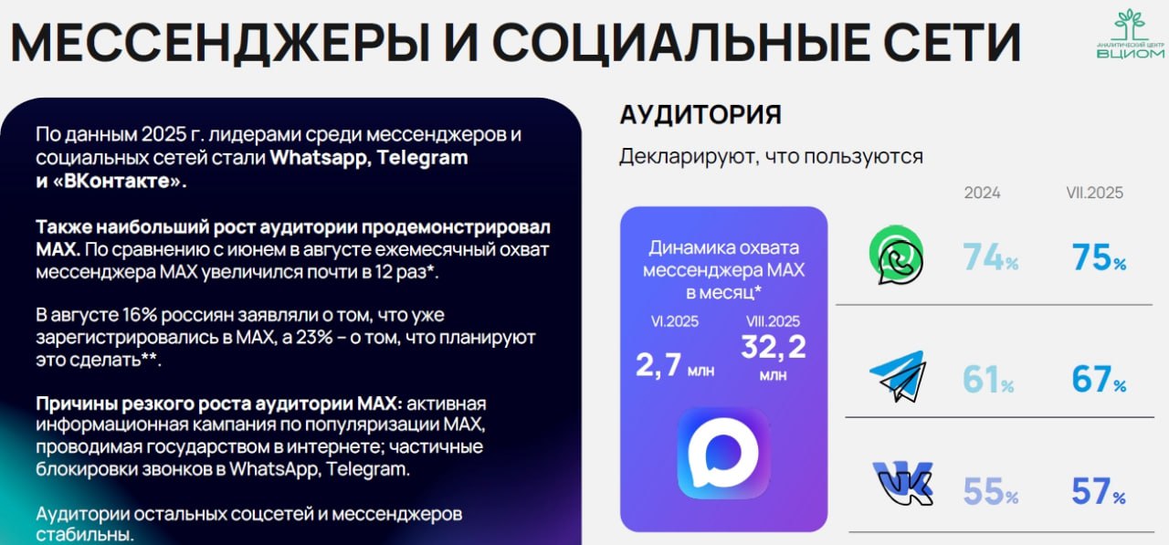 Наибольший прирост аудитории в 2025 году у MAX: в июне ежемесячный охват у него составлял 2,7 млн, а в августе – уже 32,2 млн (данные Mediascope).