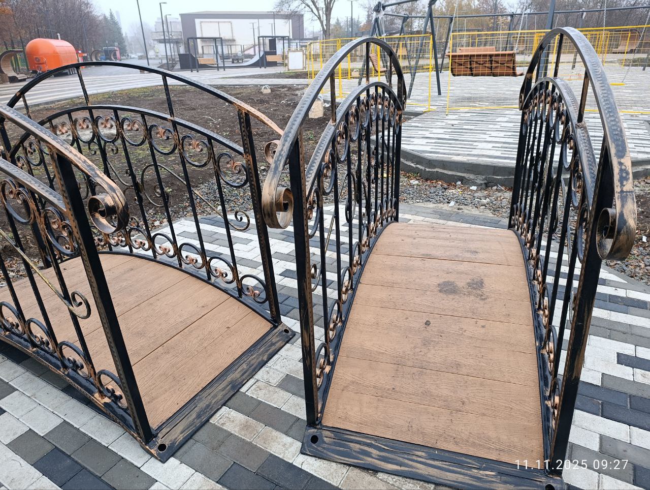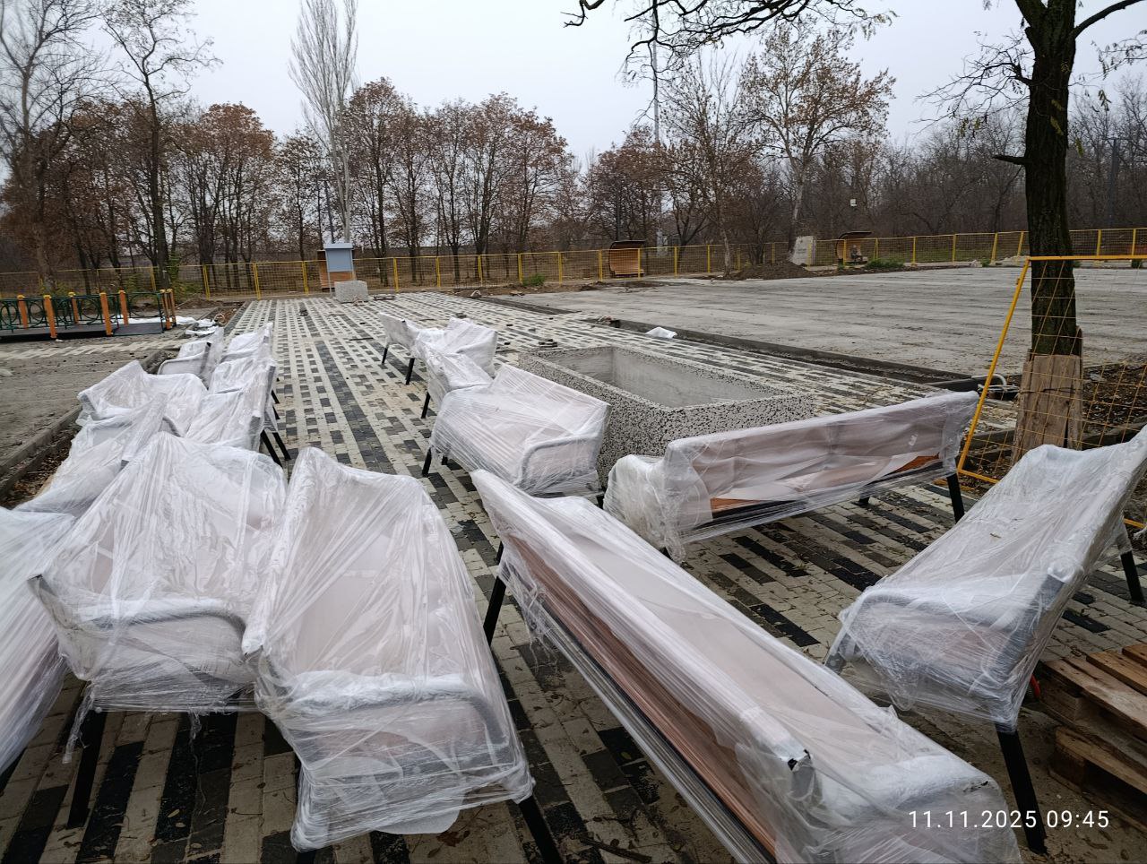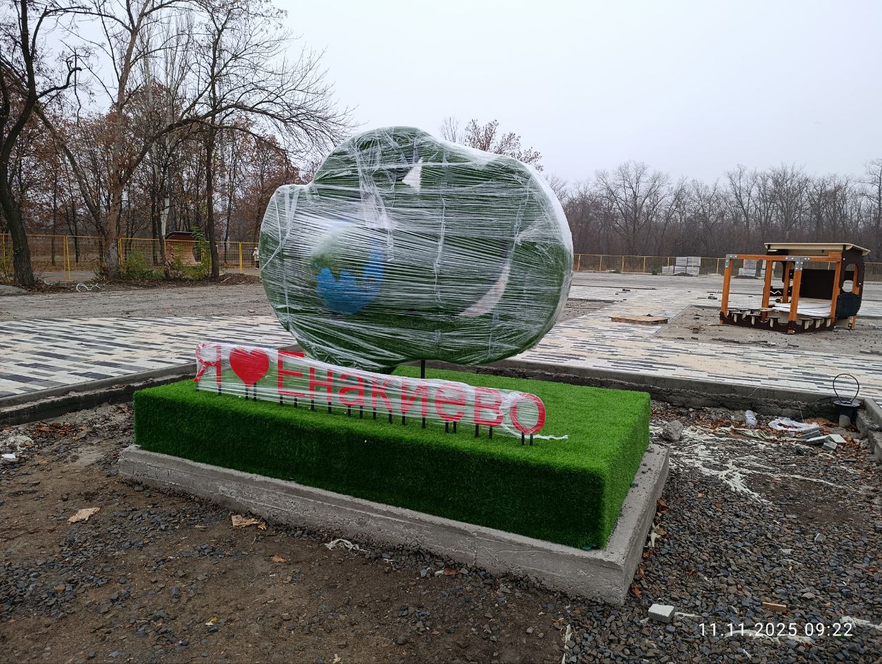 На территории парка выполнены работыпо установке поребриков и бордюров, подготовлено основание под резиновое покрытие, произведена укладка и подрезка плитки в центральной части парка, на детской площадке и в зоне коммерции. Выполнены работы по укладке кабеля в траншеи. Установлен топиар «Я люблю Енакиево». На территории парка ведутся работыпо установке детских качелей и игровых элементов, устройству контейнерной площадки и площадки под модульный туалет.Завезено 16 лавочек, два декоративных мостика и бетонные кадки под цветы.