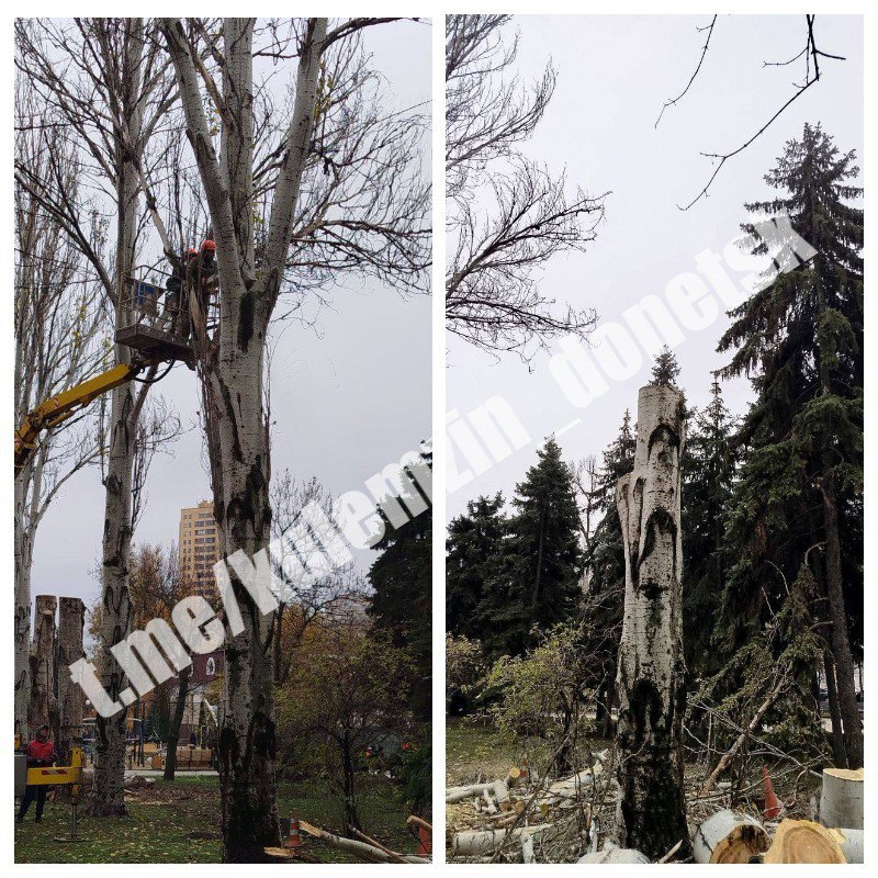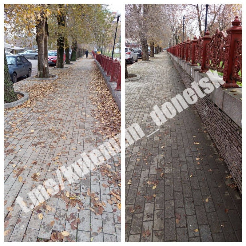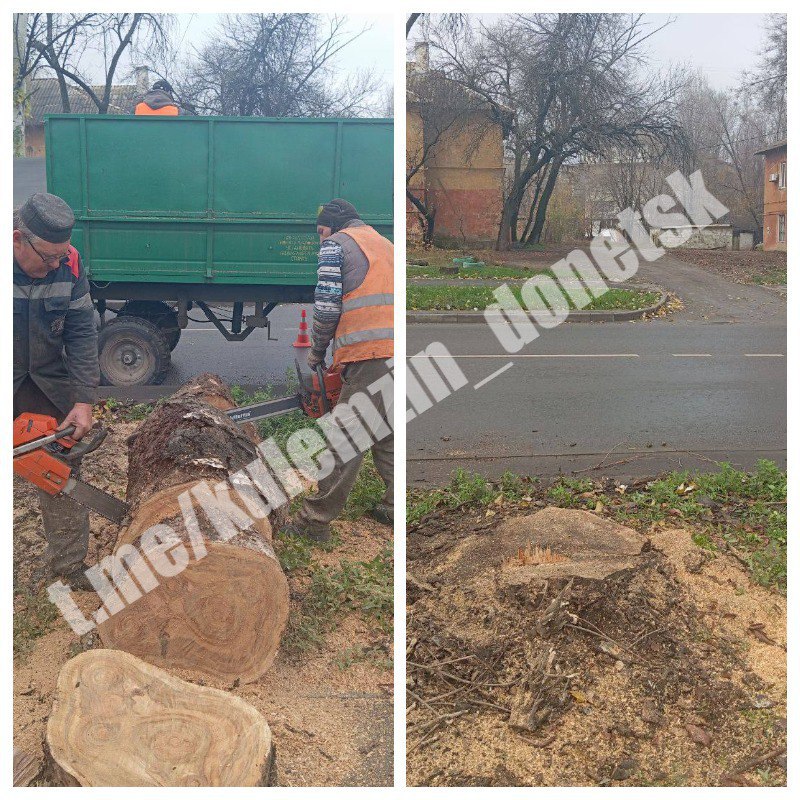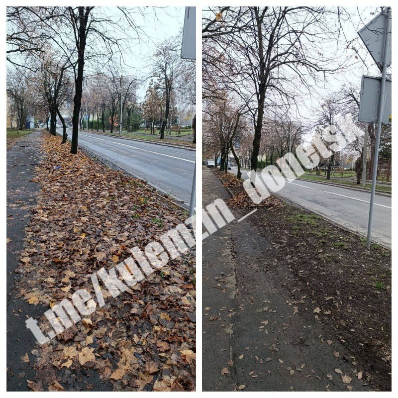 Сегодня сотрудники коммунального предприятия «Зелёное строительство» убрали опавшую листву и ветки, выполнили валку и распил деревьев, также вывезли листву, ветки, брёвна.