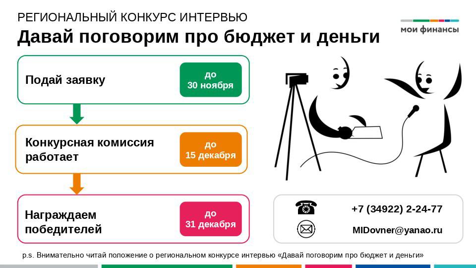 Департамент финансов Ямало-Ненецкого автономного округа объявляет о старте регионального конкурса интервью «Давай поговорим про бюджет и деньги», в котором вы можете показать не только свою финансовую грамотность, но и коммуникативные таланты.