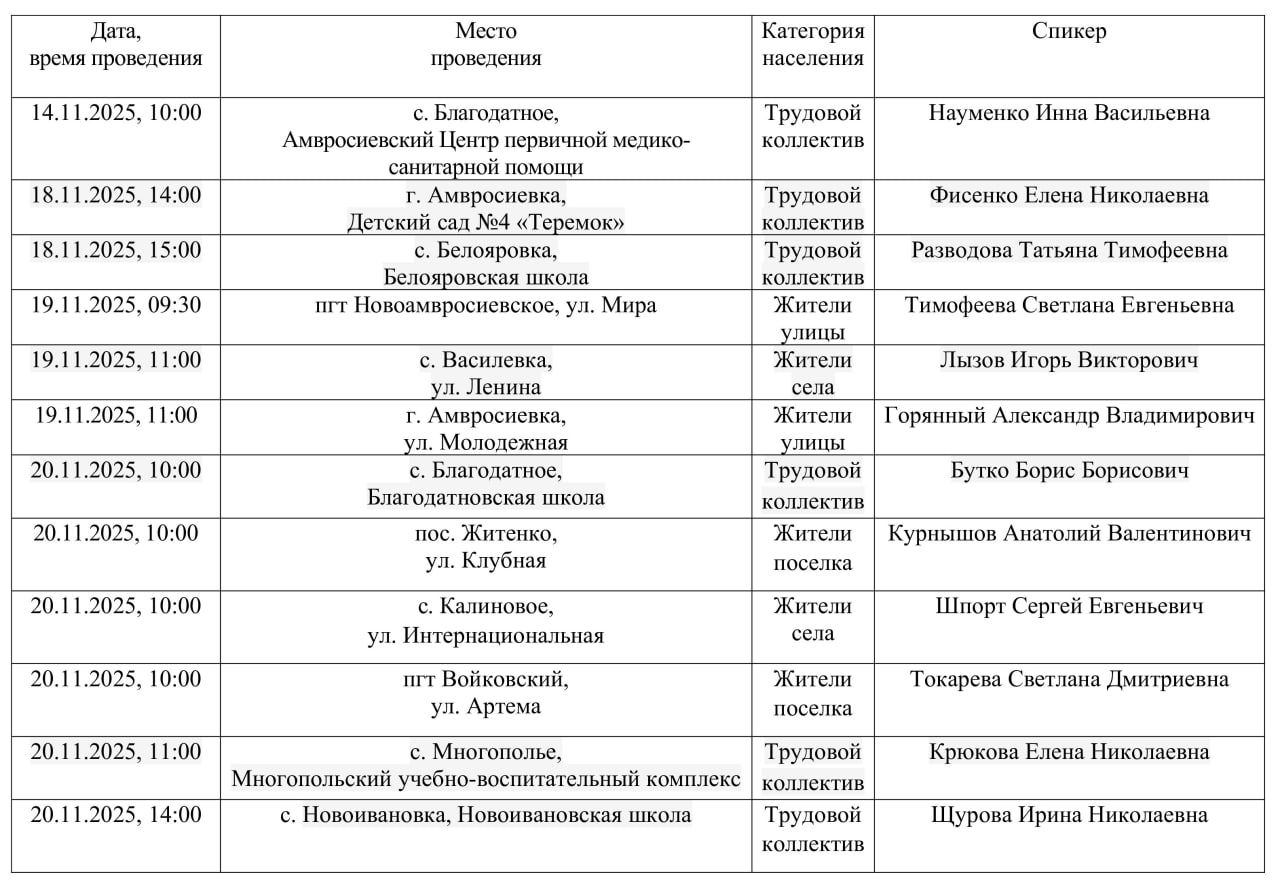 График проведения встреч с населением на подведомственных территориях руководящим составом администрации Амвросиевского муниципального округа, начальниками территориальных отделов администрации округа с 14 по 20 ноября