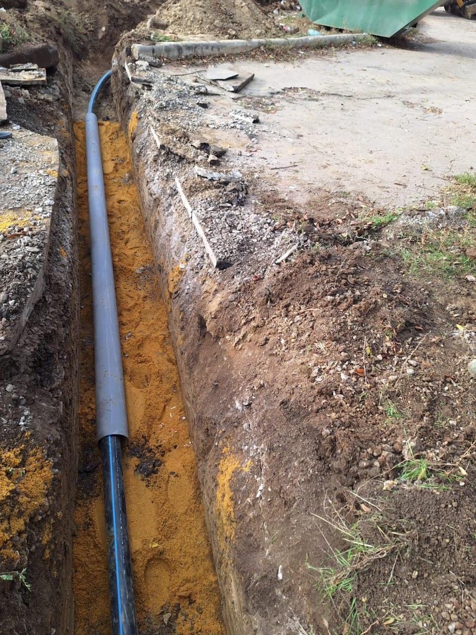 После выполнения подготовительных процедур строители при помощи тяжелой техники разработали грунт под трубопровод и приступили к укладке труб в траншею.