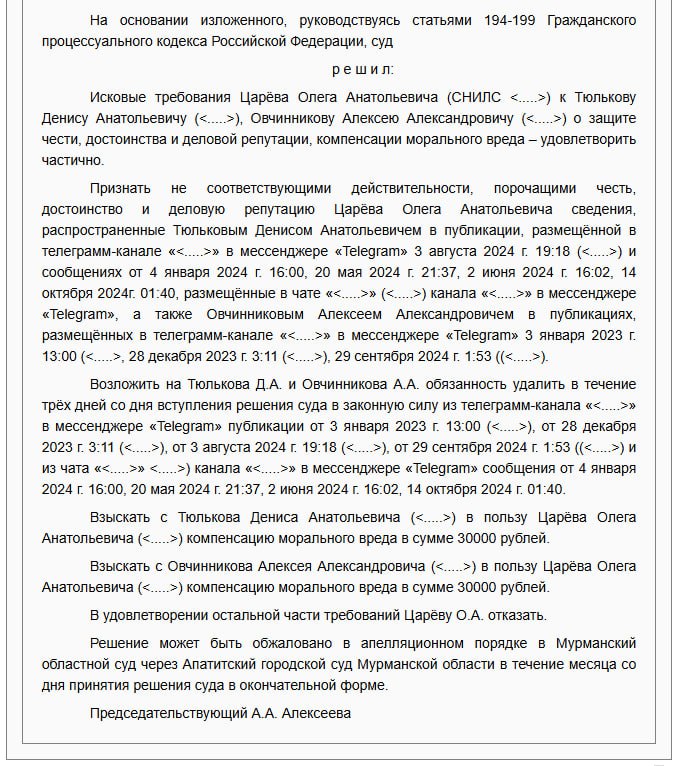 Но радует, что до этой мерзоты наконец-то дошли руки. Вот решение суда, о защите чести и достоинстве. От Олега Царева к Тюлькову Денису Анатольевичу, Овчинникову Алексею Александровичу (владельцам канала "Кошкин Сибиряк"). Сейчас таких судов будет много. Почему только сейчас? А потому что они лили дерьмо на людей, у которых просто нет времени на суды, в отличии от этих сетевых паразитов. Глядишь, и уголовку свою выхватят рано или поздно. Вчера административку за дискредитацию получила Кобелева, владелец и администратор канала "Охранота V Ватнике". В одной сетке с Тюльковым и Овчинниковым состояли, координировались.