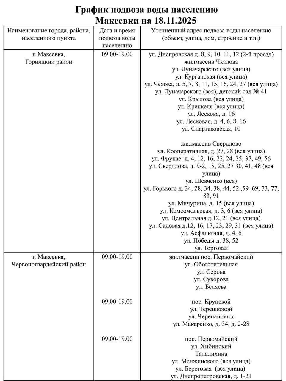 График подвоза воды населению городского округа Макеевка