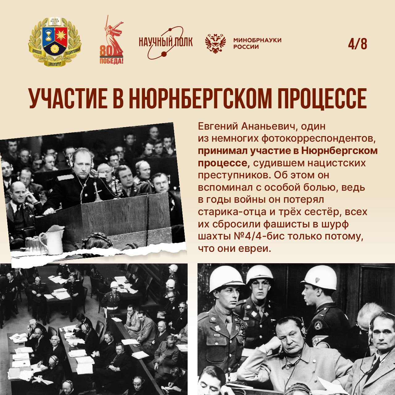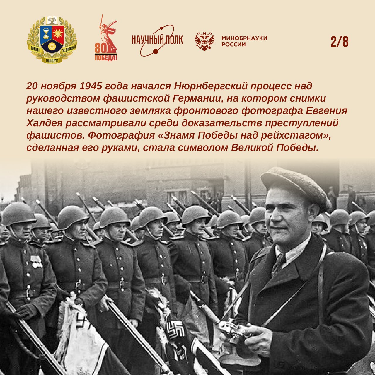 20 ноября 1945 года начался Нюрнбергский процесс над руководством фашистской Германии, на котором снимки нашего известного земляка фронтового фотографа Евгения Халдея рассматривали среди доказательств преступлений фашистов. Фотография «Знамя Победы над рейхстагом, сделанная его руками, стала символом Великой Победы.