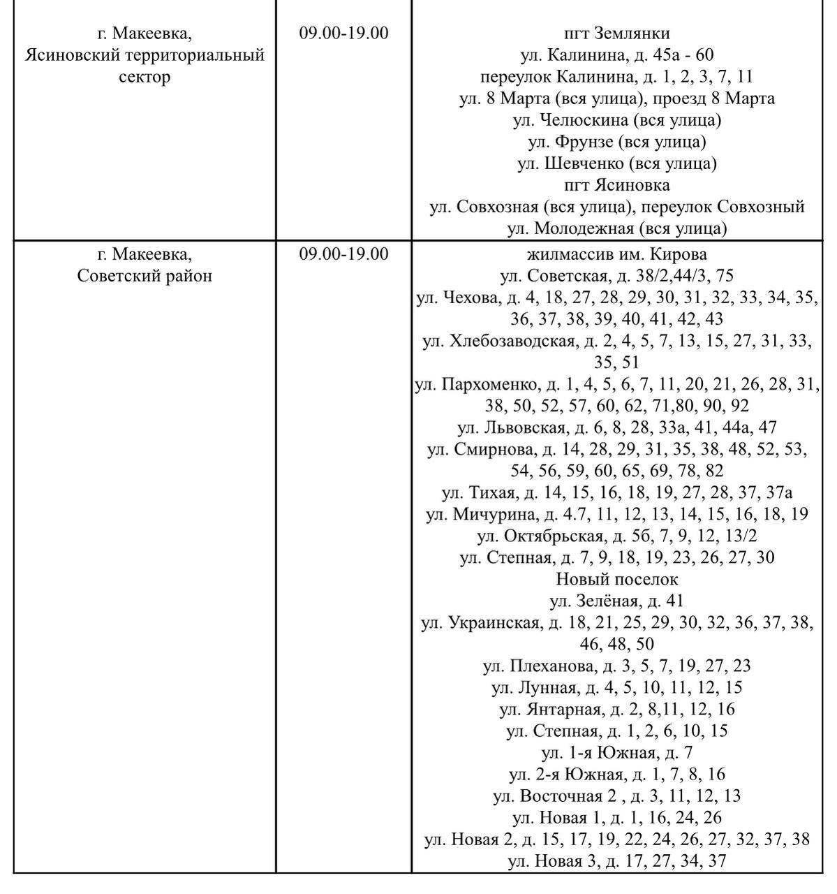 улица Г. Успенскогоулица Н. Левицкогоулица Молодежная, д.10 (ГБОУ «Школа №8»)улица Т.Бирлевой, д. 51 (ГБПОУ «Торезский техникум строительства технологий и сервиса»)микрорайон 4, д. б/н (ГБУ «ЦГБ г.Тореза»)График может корректироваться в зависимости...