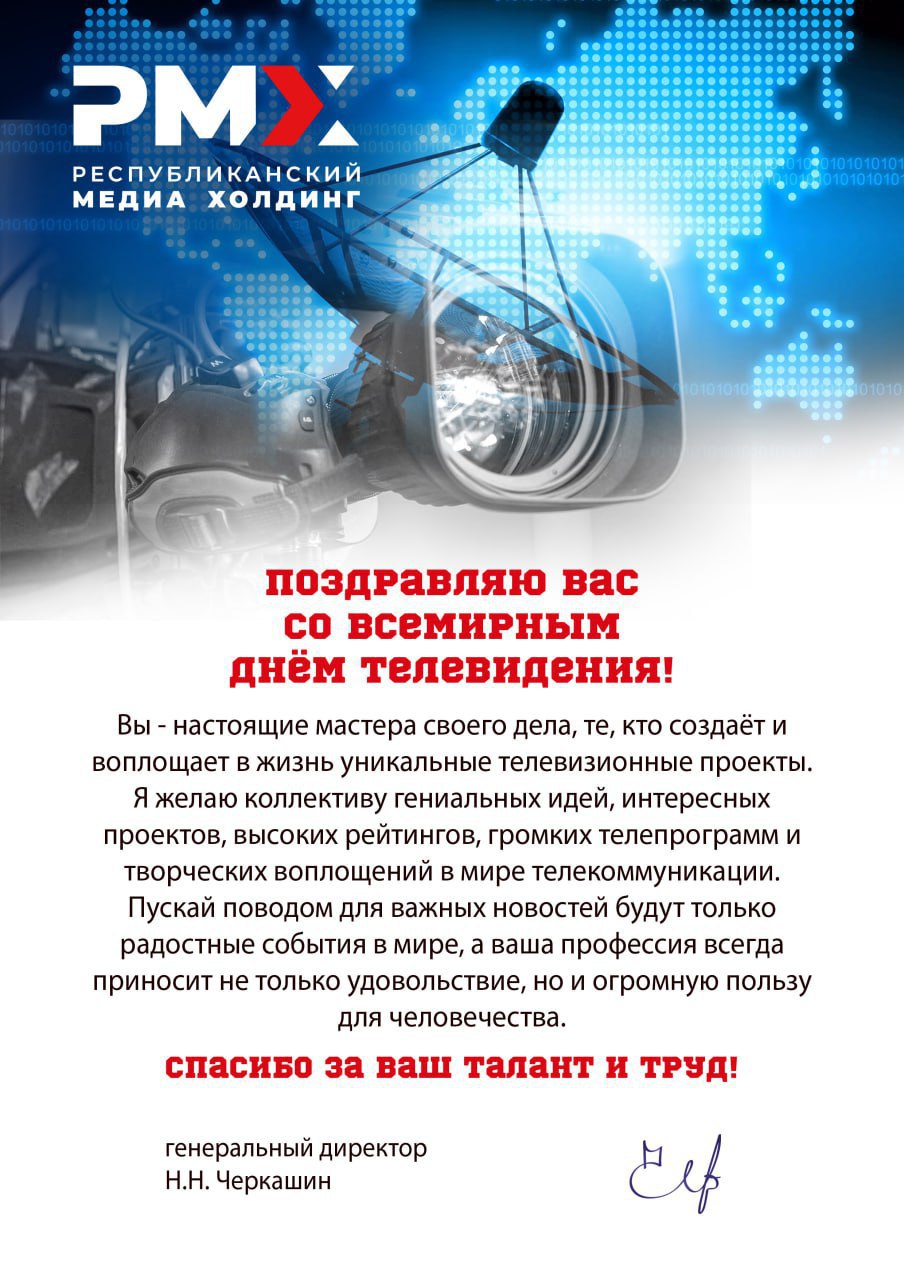 Республиканский медиа холдинг и генеральный директор РМХ, член правления "Союза журналистов России" в ДНР Николай Черкашин поздравляет медийщиков Донецкой Народной Республики со всемирным днем телевидения!