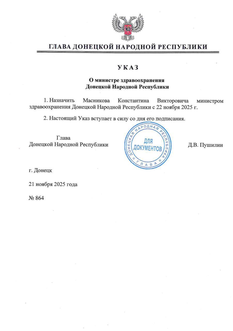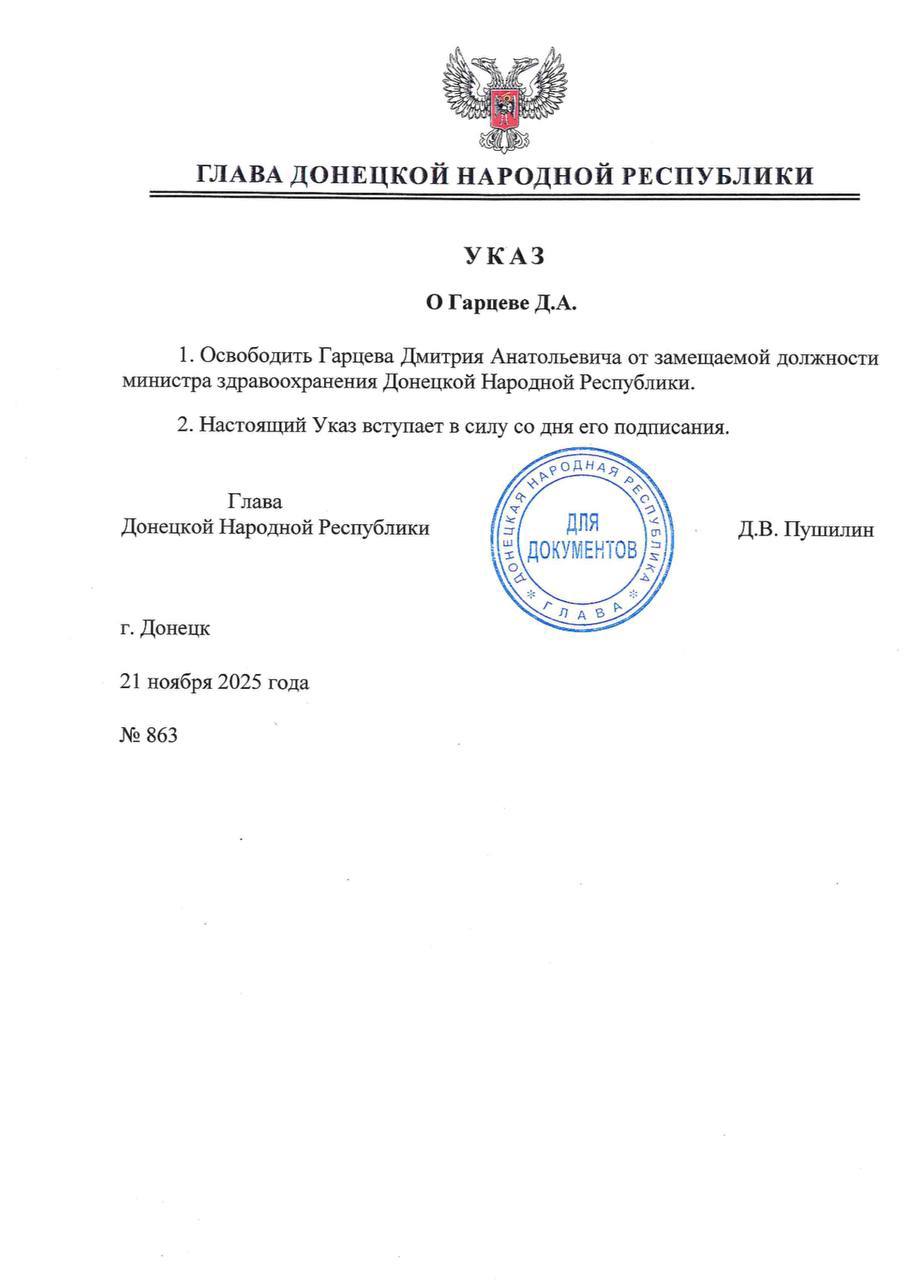 Денис Пушилин освободил Гарцева Дмитрия Анатольевича от должности Министра здравоохранения ДНР.