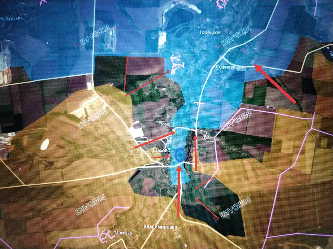 Севернее идут бои на восточной окраине Артёмовки (Софиевки). Западнее российские силы атакуют опорный пункт в Торецком, где противник пытается контратаковать с севера и северо-запада.