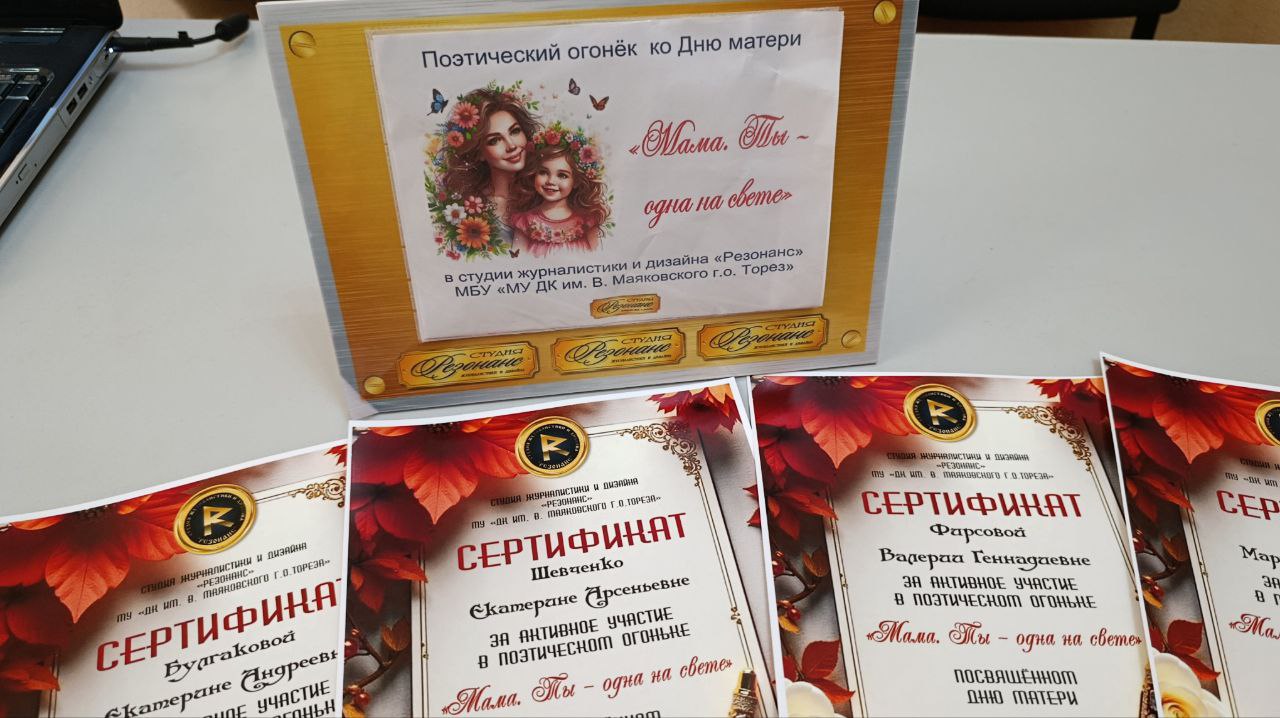 22 ноября 2025 года, в студии журналистики и дизайна «Резонанс» МБУ «ДК им. В. Маяковского г. о. Торез» состоялся поэтический огонёк «Мама. Ты – одна на свете».