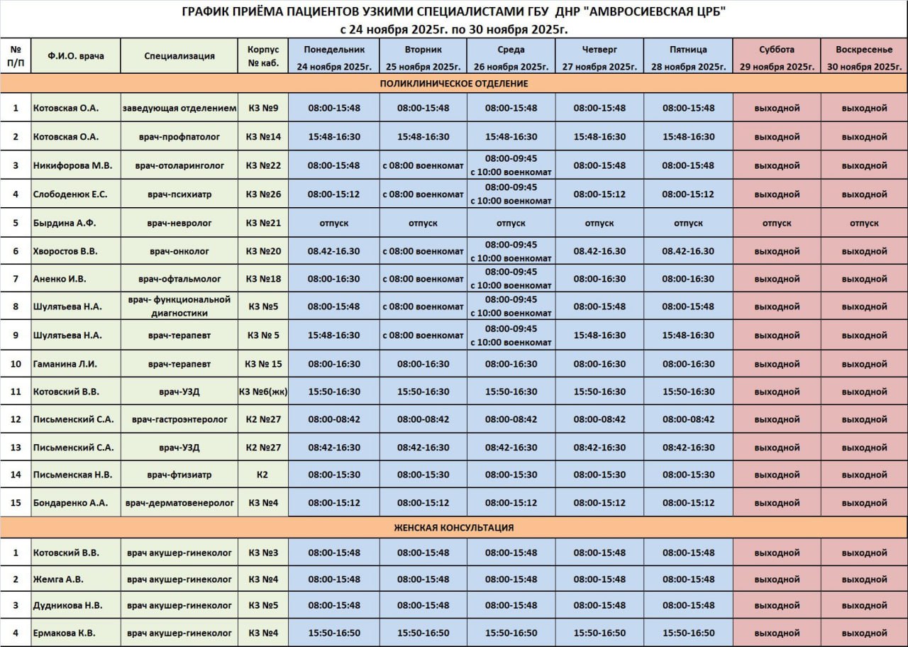 График приема врачей поликлинического отделения ГБУ ДНР "Амвросиевская ЦРБ"