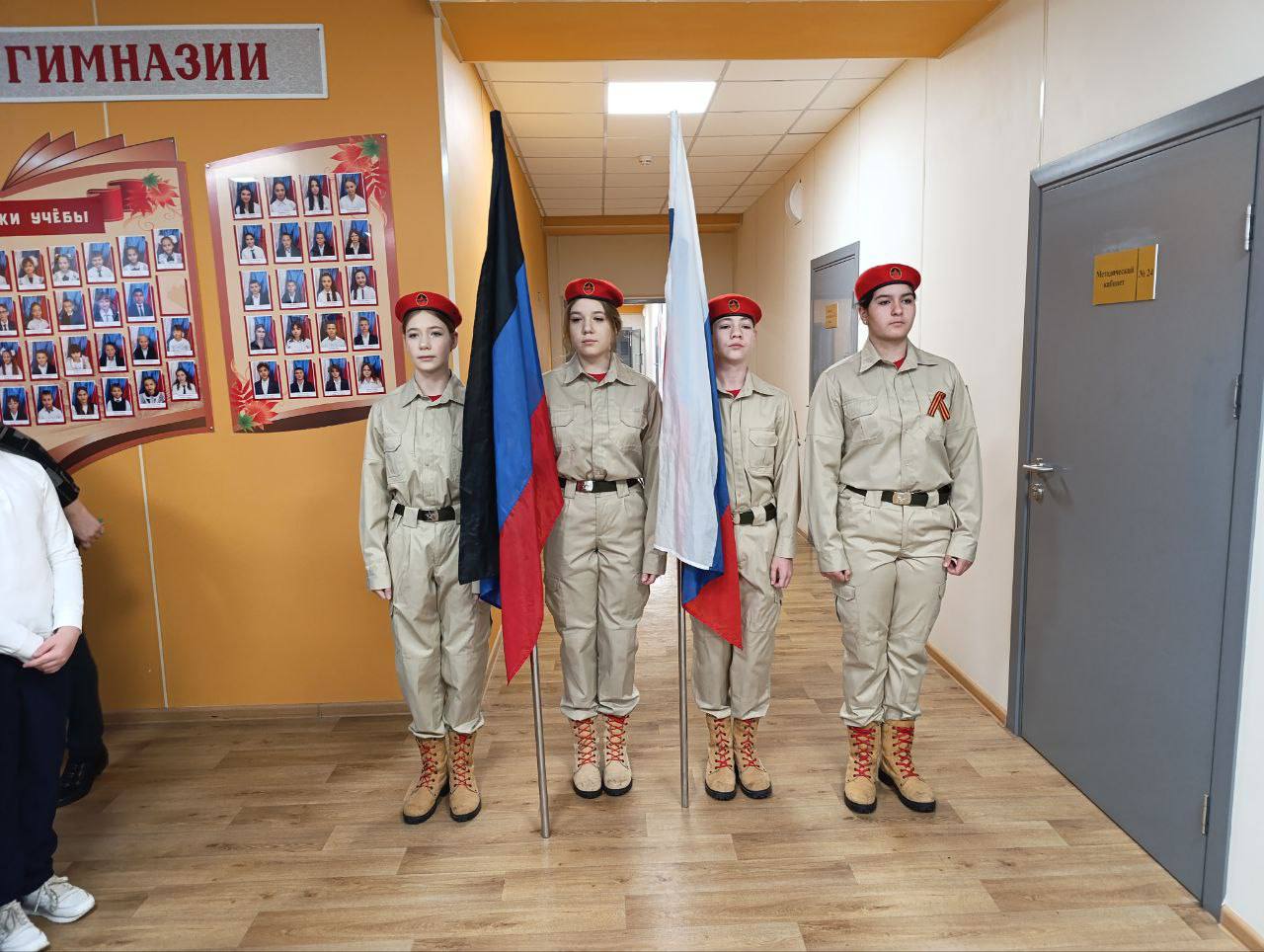 Утро в Тельмановской гимназии традиционно началось с еженедельной линейки и почётного права выноса флага Российской Федерации и флага Донецкой Народной Республики юнармейцами ВПК «Юные патриоты Донбасса» ГБОУ «Тельмановская гимназия».