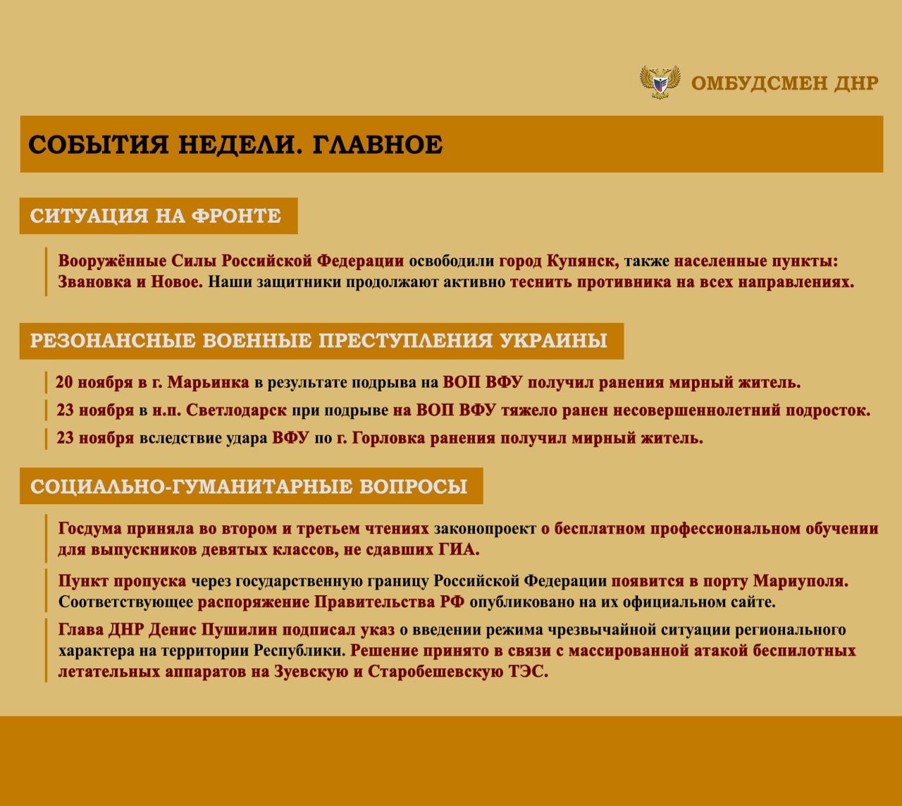 Дарья Морозова: ОБЗОР СОЦИАЛЬНО-ГУМАНИТАРНОЙ СИТУАЦИИ, СЛОЖИВШЕЙСЯ НА ТЕРРИТОРИИ ДОНЕЦКОЙ НАРОДНОЙ РЕСПУБЛИКИ ВСЛЕДСТВИЕ ВОЕННЫХ ДЕЙСТВИЙ В ПЕРИОД С 17 ПО 23 НОЯБРЯ 2025 г