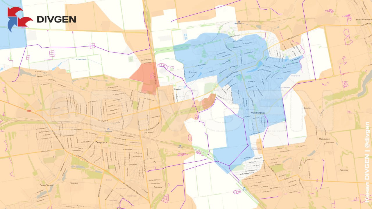 Карту продвижения ВС РФ в районе Мирноградского котла публикует ТГ-канал "DIVGEN".