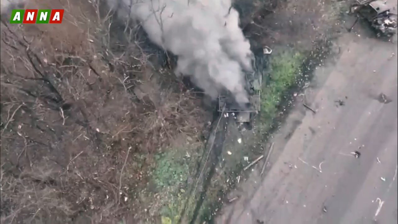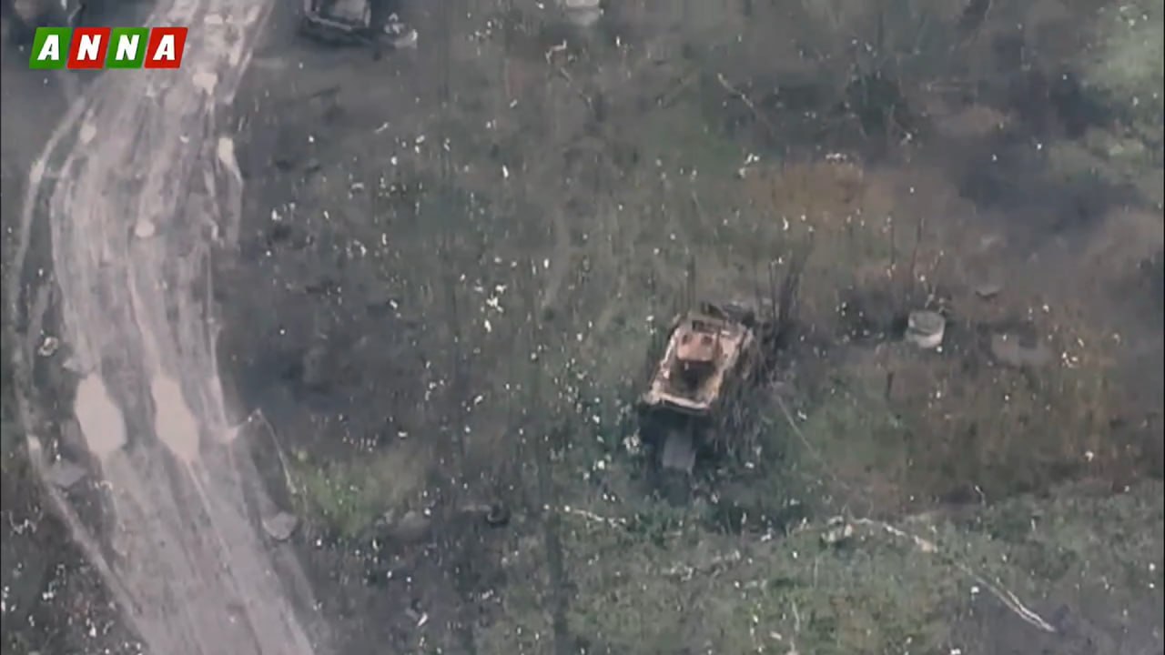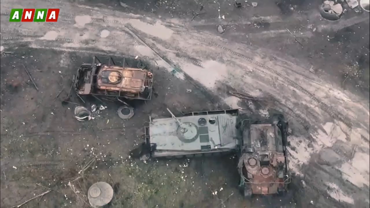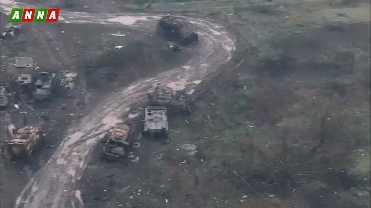 Так выглядит кладбище украинской техники между Мирноградом и Родинским. Судя по видео, оно пополнилось очередной сгоревшей бронемашиной. Видео: @anna_news