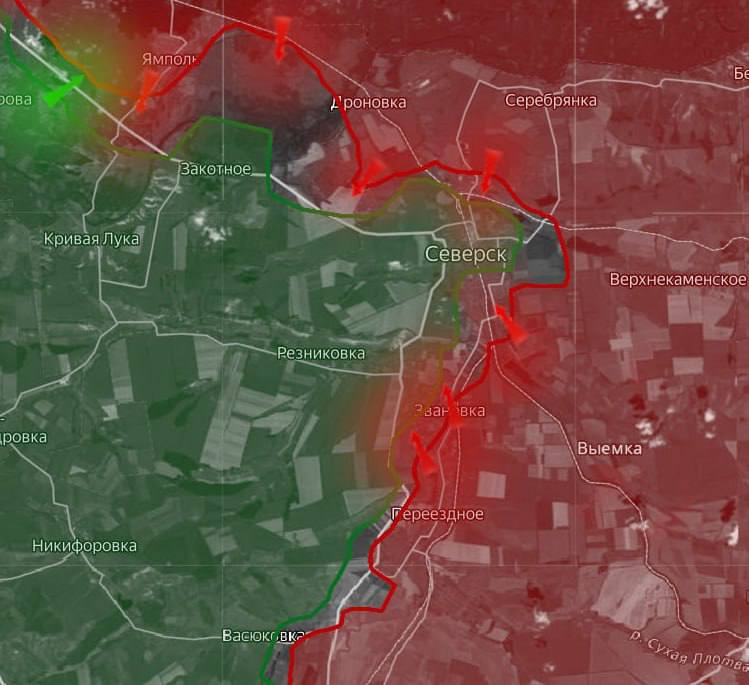 «На Северском направлении присутствие российских военнослужащих фиксируется на северо-восточной окраине Северска. Ранее они были замечены только в южной части городской застройки.