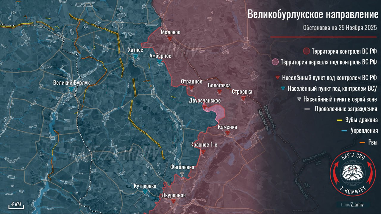 Наступательные действия ВС РФ на Харьковском и Краснолиманском направлениях, а также к северу от Часов Яра развиваются в сторону населённых пунктов Марково и Новомарково.