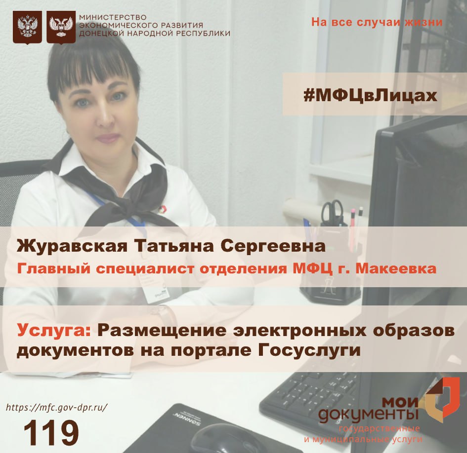 Татьяна Сергеевна – специалист в сфере оказания услуги по приему заявлений на размещение электронных образов документов на портале Госуслуги