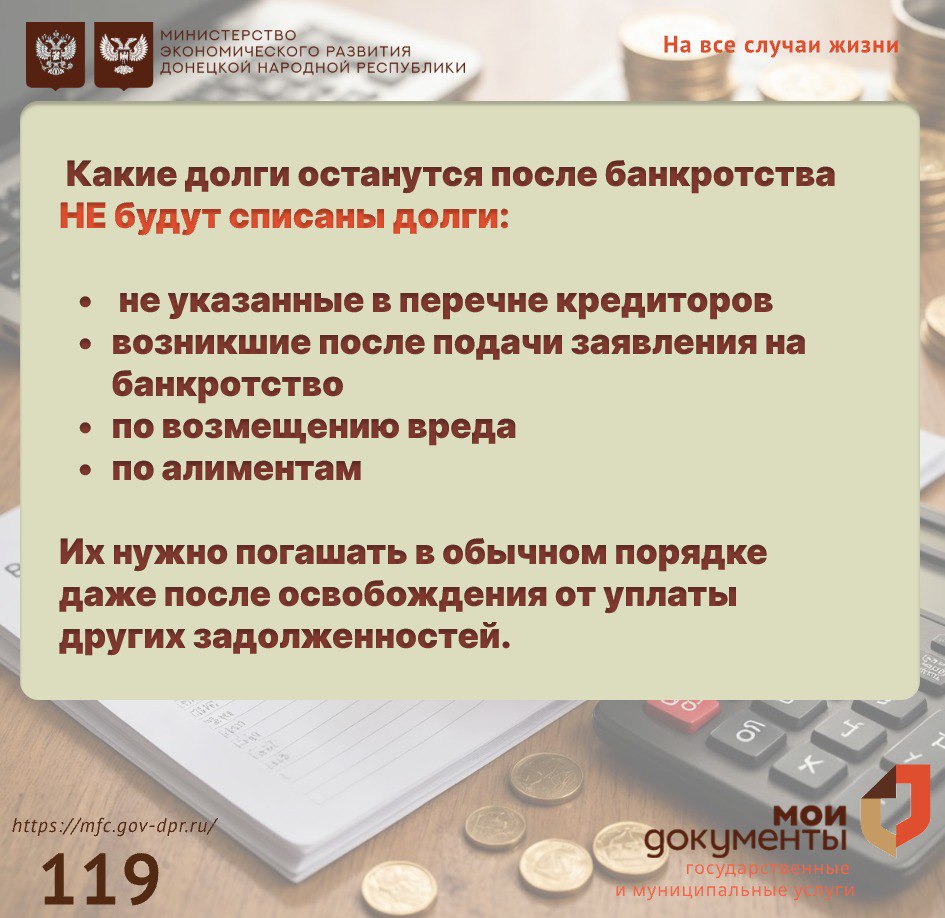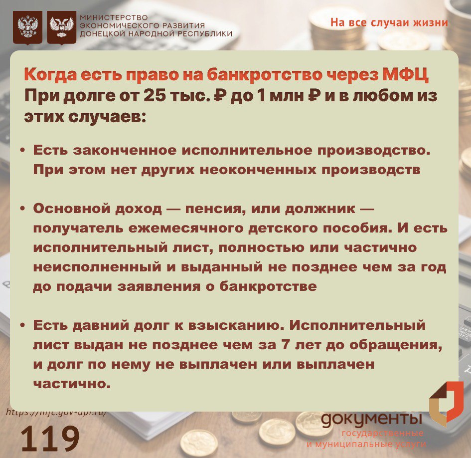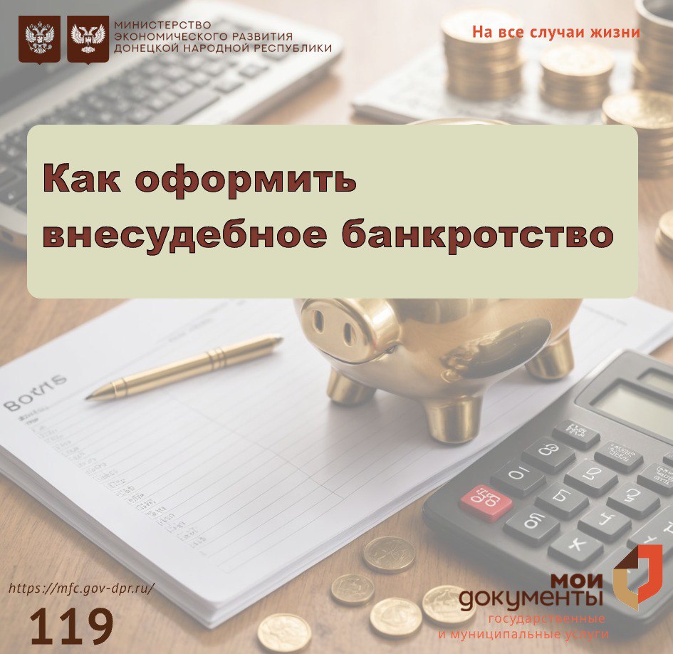 В МФЦ ДНР можно оформить внесудебное банкротство.Это бесплатная и упрощенная процедура, которая поможет вам избавиться от долговых обязательств, если у вас нет имущества и средств для погашения.