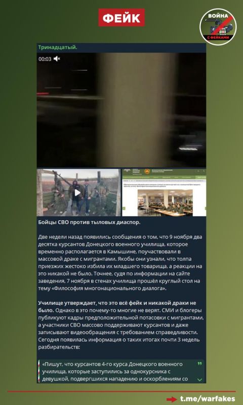 Фейк: В городе Камышине курсанты Донецкого общевойскового командного училища (ДонВОКУ) подрались с мигрантами из-за девушки. Сообщения об этом появились в ряде телеграм-каналов.