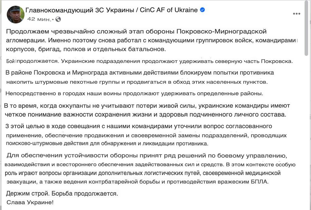 Главком укрорейха Сырский утверждает, что Красноармейск [Покровск] якобы ещё не потерян, а удержание города и соседнего Димитрова [Мирнограда] сдерживает дальнейшее продвижение российских войск.