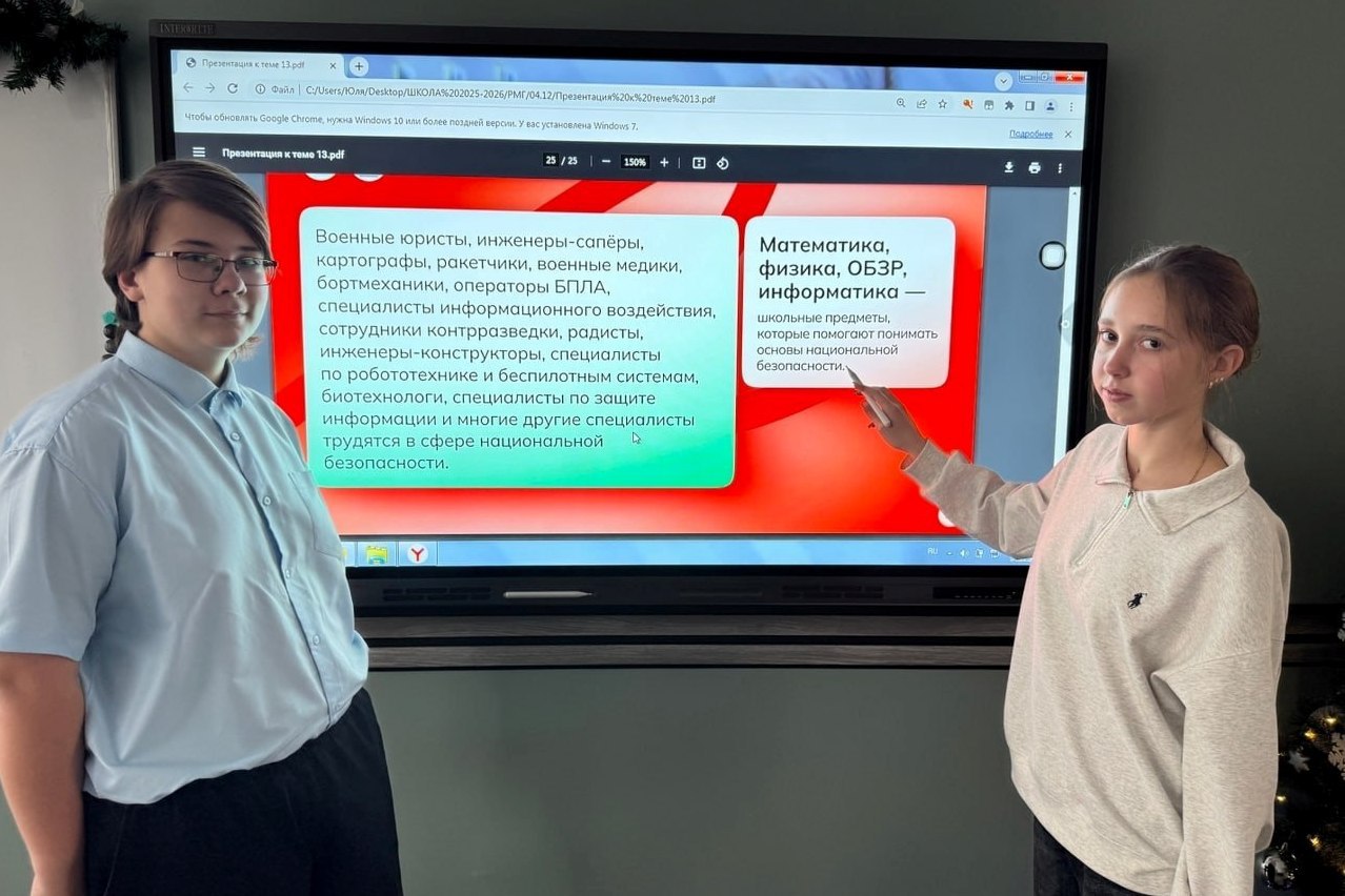 Вместе с педагогами школьники ознакомились со сферами профессиональной деятельности в области вооруженных сил и гражданской обороны. Рассмотрели систему обороны Российской Федерации. Обсудили основные профессии, актуальные задачи и перспективы развития сферы профессиональной деятельности, варианты профессионального и высшего образования. Также обучающиеся смотрели тематические видеоролики, выполняли задания, активно участвовали в дискуссии.