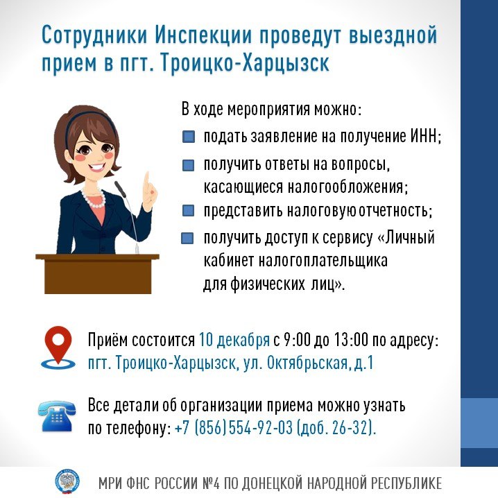Межрайонная ИФНС России №4 по Донецкой Народной Республике проведет выездной прием в пгт. Троицко-Харцызск.