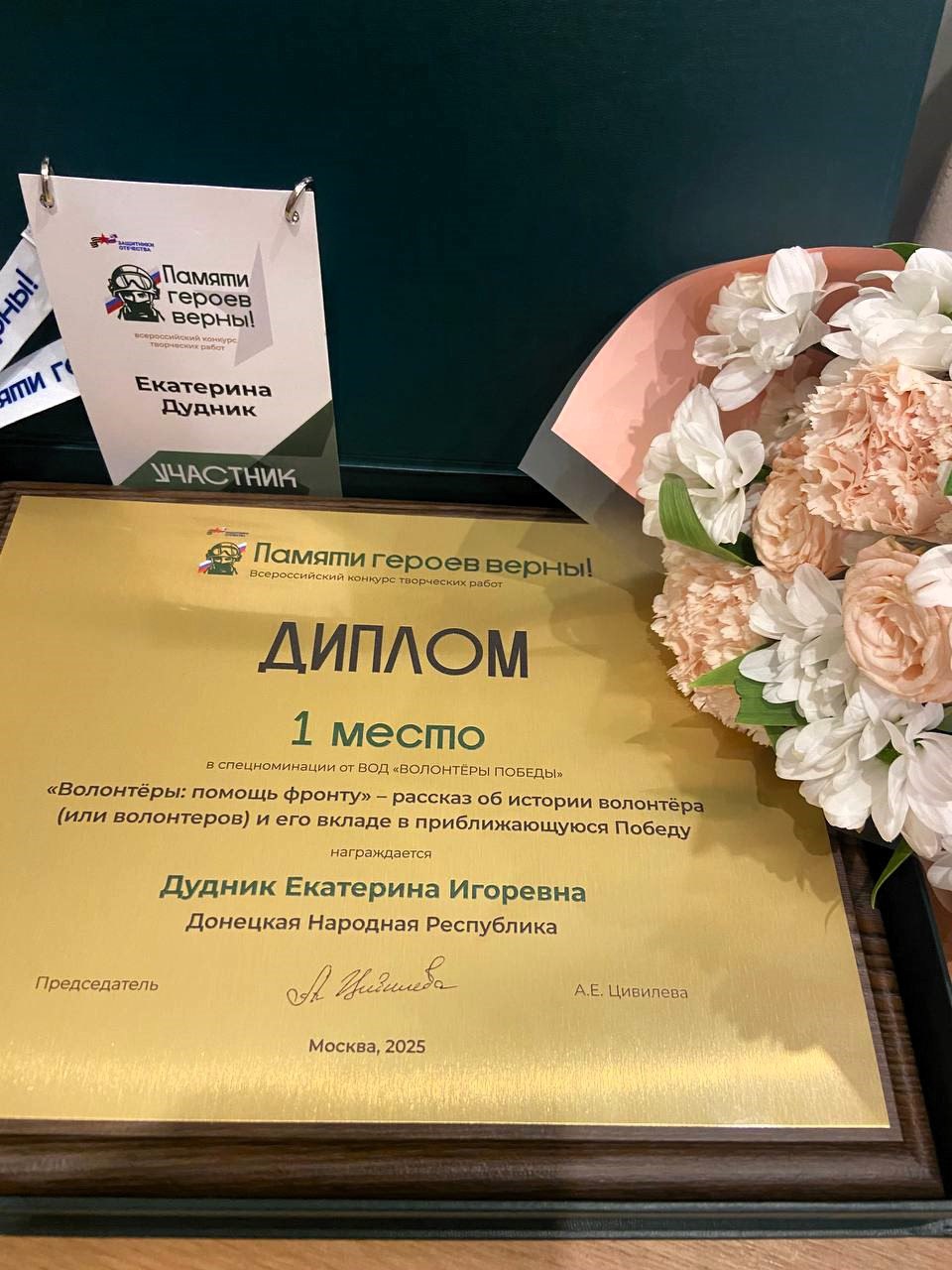 Так, 4 декабря, в торжественной обстановке зала «Жуков» Музея Победы в Москве, на церемонии награждения собрались свыше 90 победителей конкурса со всех уголков страны. В их число вошли трое победителей из Донецкой Народной Республики, чьи таланты были отмечены высокими наградами. В категории 7-13 лет Андрей Антоненко был удостоен призового места за рисунок, посвященный участникам и/или их семьям, событиям СВО. Анастасия Варсегова, также в возрастной категории 7-13 лет, стала призером в номинации «Авторская песня». Рассказ Екатерины Дудник, в возрастной категории 18-35 лет, занял первое место в специальной номинации «Волонтеры: помощь фронту», организованной совместно с Всероссийским общественным движением «ВОЛОНТЕРЫ ПОБЕДЫ».